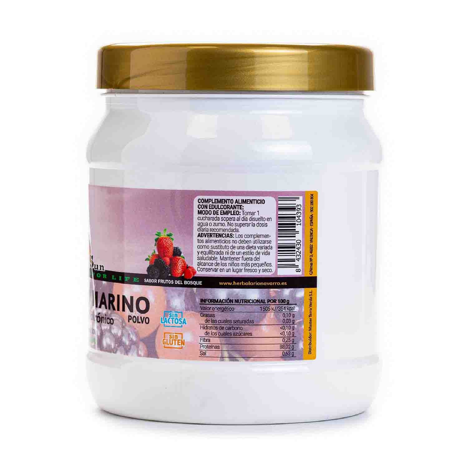 https://www.herbolarionavarro.es/colageno-marino-sabor-a-frutos-del-bosque-300g-green-sun79405Colágeno Marino sabor a Frutos del Bosque 300g Green Sun<h2>¿Qué es Colágeno Marino sabor a Frutos del Bosque Green Sun?</h2><p>El <strong>Colágeno Marino sabor a Frutos del Bosque de Green Sun</strong> es un complemento alimenticio en polvo formulado con <strong>colágeno hidrolizado Peptan® 2000 LD de origen marino</strong>, enriquecido con magnesio, vitamina C y ácido hialurónico. Una combinación diseñada para quienes buscan apoyar la función normal de huesos, músculos y piel, especialmente a partir de los 30 años, cuando la producción natural de colágeno comienza a disminuir.</p><p>Con un delicioso sabor a frutos del bosque y una fórmula fácilmente soluble, es ideal para integrar en tu rutina diaria de cuidado desde el interior.</p><h2>Beneficios del Colágeno Marino de Green Sun</h2><p>Gracias a su formulación específica, este complemento ofrece múltiples beneficios para el cuidado integral del organismo:</p><ul><li><p><strong>Formación normal de colágeno: </strong>la vitamina C contribuye a la formación normal de colágeno para el funcionamiento normal de los huesos.</p></li><li><p><strong>Mantenimiento de huesos y músculos: </strong>el magnesio contribuye al mantenimiento de huesos en condiciones normales, el funcionamiento normal de los músculos y ayuda a la reducción del cansancio y la fatiga.</p></li><li><p><strong>Apoyo nutricional a la piel</strong>: el producto incluye ácido hialurónico, un componente natural de la piel y el líquido sinovial, relacionado con la hidratación y elasticidad.</p></li><li><p><strong>Colágeno marino hidrolizado: </strong>el colágeno Peptan® es una proteína estructural presente de forma natural en articulaciones, piel y tejidos conectivos.</p></li></ul><h2>¿Por qué elegir el Colágeno Marino sabor a Frutos del Bosque?</h2><p>Cuando empiezas a notar que la piel pierde firmeza, que las articulaciones duelen más tras el ejercicio o que los huesos necesitan un apoyo extra, es momento de reforzar tu organismo desde dentro. El <strong>colágeno marino</strong> <strong>hidrolizado</strong> el cuerpo lo asimila de forma más eficiente. A diferencia de otros colágenos animales, este se obtiene del pescado y ofrece una mejor biodisponibilidad.</p><h3>¿Cómo tomar Colágeno Marino sabor a Frutos del Bosque?</h3><p>Recomendamos una dosis de 10 gramos diarios (una cucharada sopera) por la mañana, diluyéndolo en un vaso de agua o zumo. Remover hasta su completa disolución y tomar preferiblemente fuera de las comidas. Tiene un sabor a frutos del bosque que lo hace delicioso.</p><h3>¿Quieres saber más sobre el colágeno marino?</h3><p>Si te interesa conocer en profundidad los beneficios del colágeno marino, cómo integrarlo en tu día a día o descubrir más consejos para cuidar tu bienestar de forma natural, te invitamos a leer nuestro <a target="_blank" rel="" style="--tw-border-spacing-x: 0; --tw-border-spacing-y: 0; --tw-translate-x: 0; --tw-translate-y: 0; --tw-rotate: 0; --tw-skew-x: 0; --tw-skew-y: 0; --tw-scale-x: 1; --tw-scale-y: 1; --tw-pan-x: ; --tw-pan-y: ; --tw-pinch-zoom: ; --tw-scroll-snap-strictness: proximity; --tw-gradient-from-position: ; --tw-gradient-via-position: ; --tw-gradient-to-position: ; --tw-ordinal: ; --tw-slashed-zero: ; --tw-numeric-figure: ; --tw-numeric-spacing: ; --tw-numeric-fraction: ; --tw-ring-inset: ; --tw-ring-offset-width: 0px; --tw-ring-offset-color: #fff; --tw-ring-color: rgba(59,130,246,.5); --tw-ring-offset-shadow: 0 0 #0000; --tw-ring-shadow: 0 0 #0000; --tw-shadow: 0 0 #0000; --tw-shadow-colored: 0 0 #0000; --tw-blur: ; --tw-brightness: ; --tw-contrast: ; --tw-grayscale: ; --tw-hue-rotate: ; --tw-invert: ; --tw-saturate: ; --tw-sepia: ; --tw-drop-shadow: ; --tw-backdrop-blur: ; --tw-backdrop-brightness: ; --tw-backdrop-contrast: ; --tw-backdrop-grayscale: ; --tw-backdrop-hue-rotate: ; --tw-backdrop-invert: ; --tw-backdrop-opacity: ; --tw-backdrop-saturate: ; --tw-backdrop-sepia: ; --tw-contain-size: ; --tw-contain-layout: ; --tw-contain-paint: ; --tw-contain-style: ; box-sizing: border-box; border: 0px solid rgb(229, 231, 235); scrollbar-color: auto; scrollbar-width: auto; --tw-border-opacity: 1; color: inherit; text-decoration: underline; font-weight: 400;" href="https://www.herbolarionavarro.es/blog"><u>blog</u></a>.</p><h3>Advertencias</h3><p>No superar la dosis diaria recomendada. Mantener fuera del alcance de los niños más pequeños. Los complementos alimenticios no deben utilizarse como sustituto de una dieta variada y equilibrada ni de un estilo de vida saludable. Conservar en lugar fresco y seco.</p>https://www.herbolarionavarro.es/media/catalog/product/9/9/997000408_1.jpg28.99instock028.9926.35454445454500Green Sun134.769230769230813https://www.herbolarionavarro.es/media/catalog/product/9/9/997000408_1.jpg/Suplementación/Suplementación/Minerales y Oligoelementos/Suplementación/Minerales y Oligoelementos/Magnesio/Suplementación/Deportistas/Destacados/Día de la Madre/Black Friday/Black Friday/Black Friday Suplementos/Suplementación/Colágeno/Suplementación/Ácido hialurónico/Ofertas/2ª UNIDAD AL 50%/Ofertas/2ª UNIDAD AL 50%/Promociones en dietética/Green Sun/Ofertas/Marcas propias Herbolario Navarro2022-12-05T15:58:02+00001, 2951300