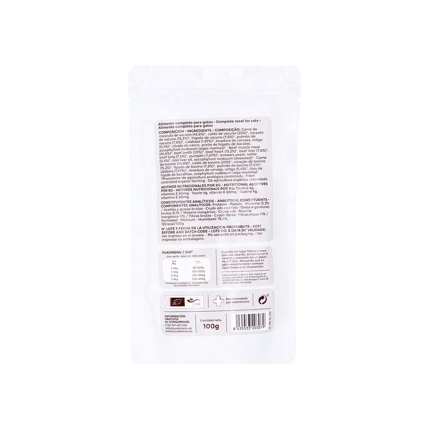 Alimento natural con textura de paté, cocido y equilibrado, especialmente formulado para gatos y gatitos de cualquier raza. Está compuesto en un 96% de carne de vacuno, acompañada de ingredientes saludables como calabaza y ortiga, que complementan la dieta felina. Este menú es monoprotéico, lo que significa que tiene una sola fuente de proteína animal (vacuno), y está enriquecido con taurina, un aminoácido esencial para los gatos. No contiene cereales, gluten ni aditivos sintéticos.