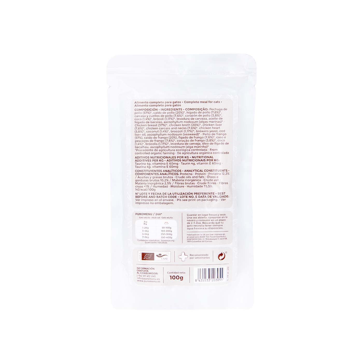 Alimento natural con textura de paté, cocido y equilibrado, diseñado para gatos y gatitos de cualquier raza. Este menú está compuesto por un 96% de pollo, específicamente pechuga de pollo, y se complementa con ingredientes como brócoli y coco. La fórmula ha sido elaborada por expertos en nutrición felina, lo que garantiza que cumple con las necesidades de un carnívoro estricto como es el gato. Además, es un producto monoprotéico, lo que significa que tiene una única fuente de proteína animal, sin la adición de vitaminas y minerales sintéticos, cereales ni gluten.
