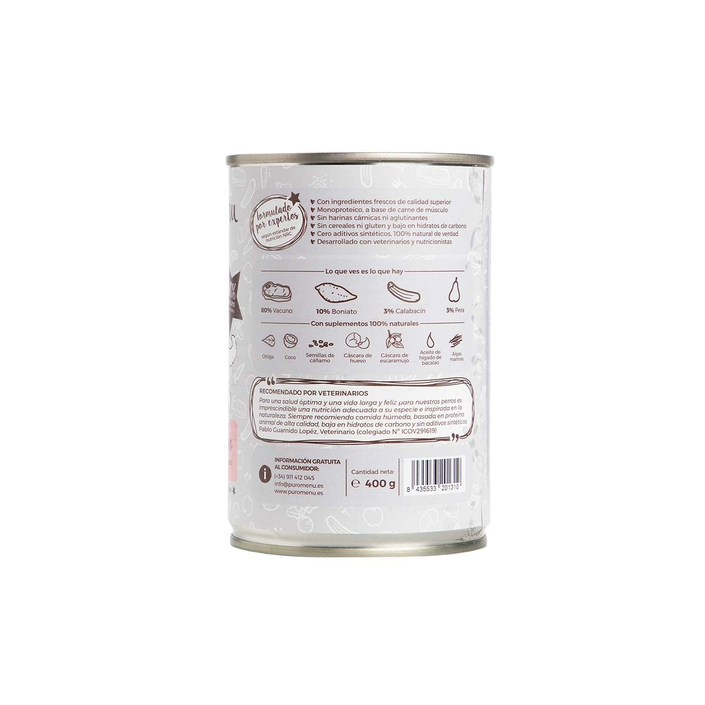 Alimento ecológico, cocido, completo y equilibrado diseñado específicamente para la alimentación de perros. Este menú está compuesto por un 80% de carne de vacuno, lo que lo convierte en una opción monoproteica de alta calidad, ya que utiliza solo una fuente de proteína animal. Además de la carne, incluye ingredientes saludables como boniato, calabacín y pera, que aportan nutrientes esenciales.