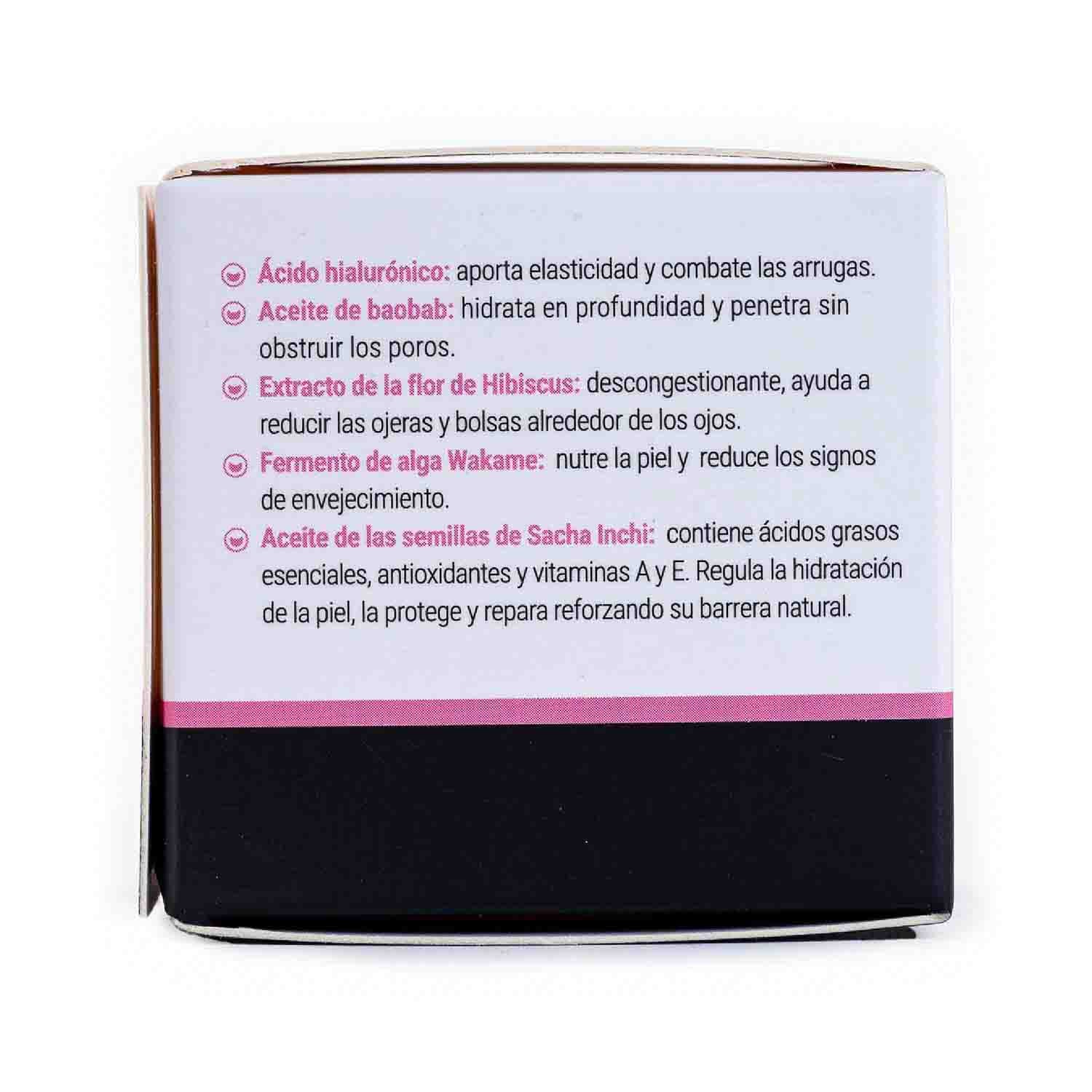 - El extracto de la flor de hibiscus tiene propiedades descongestionantes y ayuda a reducir las ojeras y bolsas alrededor de los ojos.