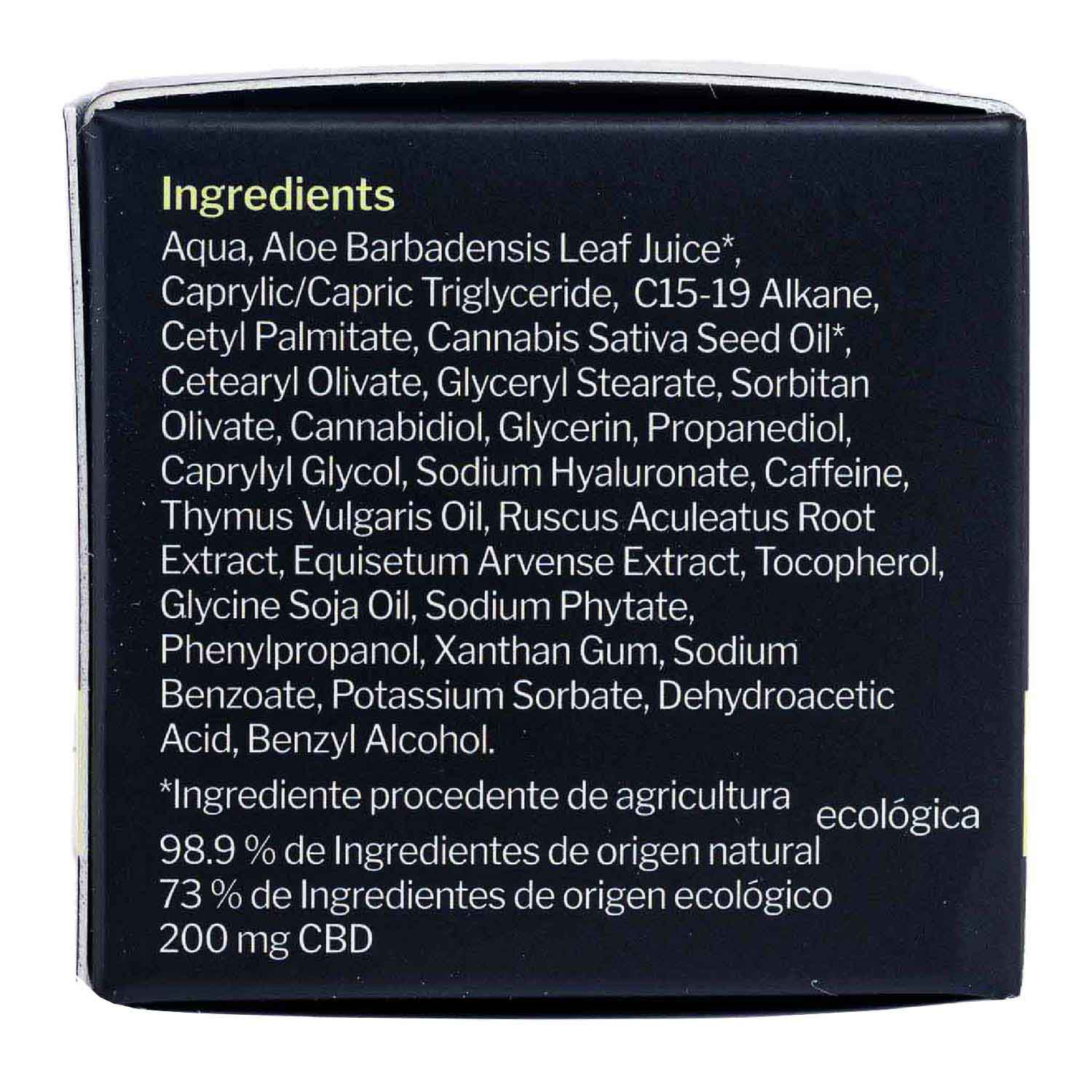 Sorbitan Olivate, Cannabidiol,, Glycerin, Propanediol, Caprylyl Glycol, Sodium Hyaluronate, Caffeine, Thymus Vulgaris Oil, Ruscus Aculeatus Root Extract, Equisetum Arvense Extract, Tocopherol, Glycine Soja Oil, Sodium Phytate, Phenylpropanol, Xanthan Gum, Sodium Benzoate, Potassium Sorbate, Dehydroacetic Acid, Benzyl Alcohol.