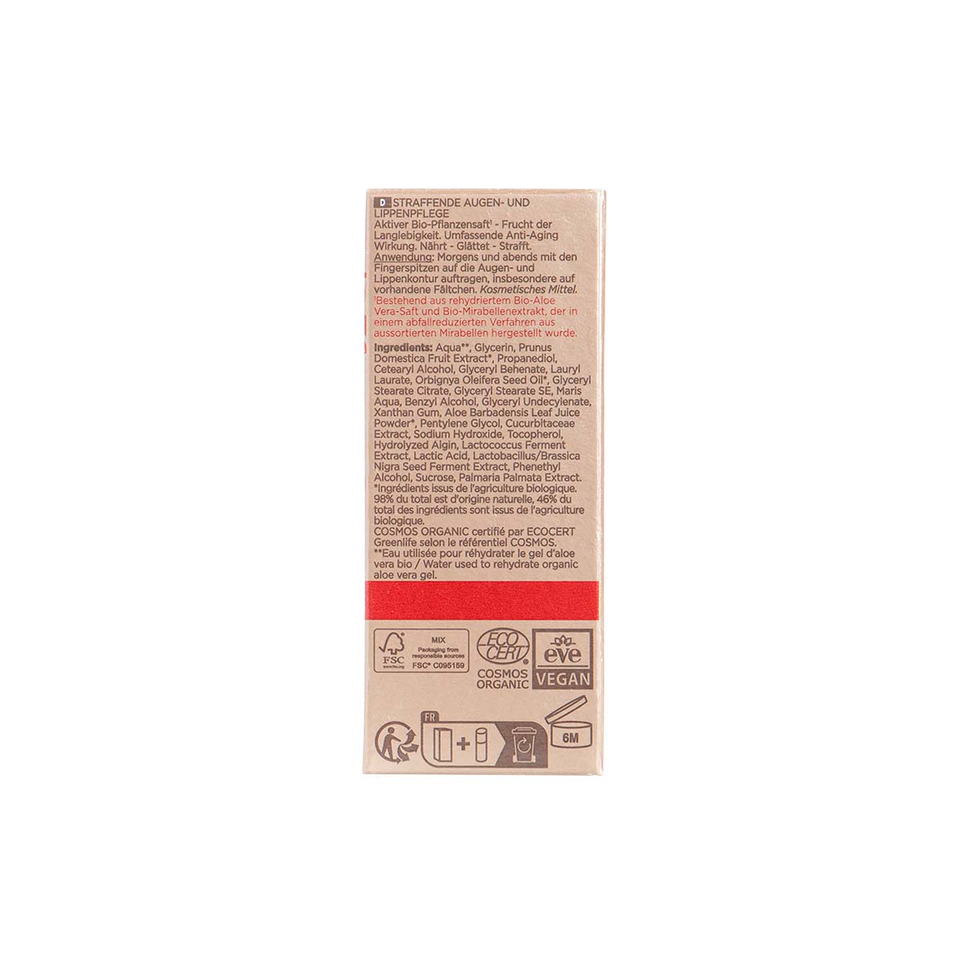 Aqua**, Glycerin, Prunus Domestica Fruit Extract, Propanediol, Cetearyl Alcohol, Glyceryl Behenate, Lauryl Laurate, Orbignya Oleifera Seed Oil, Glyceryl Stearate Citrate, Glyceryl Stearate SE, maris Aqua, Benzyl Alcohol, Glyceryl Undecylenate, Xanthan Gum, Aloe Barbadensis Leaf Juice Powder*, Pentylene Glycol, Cucurbitaceae Extract, Sodium Hydroxide, Tocopherol, Hydrolyzed Algin, Lactococcus Ferment Extract, Lactic Acid, Lactobacillus/Brassica Nigra Seed Ferment Extract, Phenethyl Alcohol, Sucrose, Palmaria Palmata Extract. Ingredientes procedentes de la agricultura ecológica. El 98% del total es de origen natural, el 46% del total de los ingredientes procede de la agricultura ecológica.
