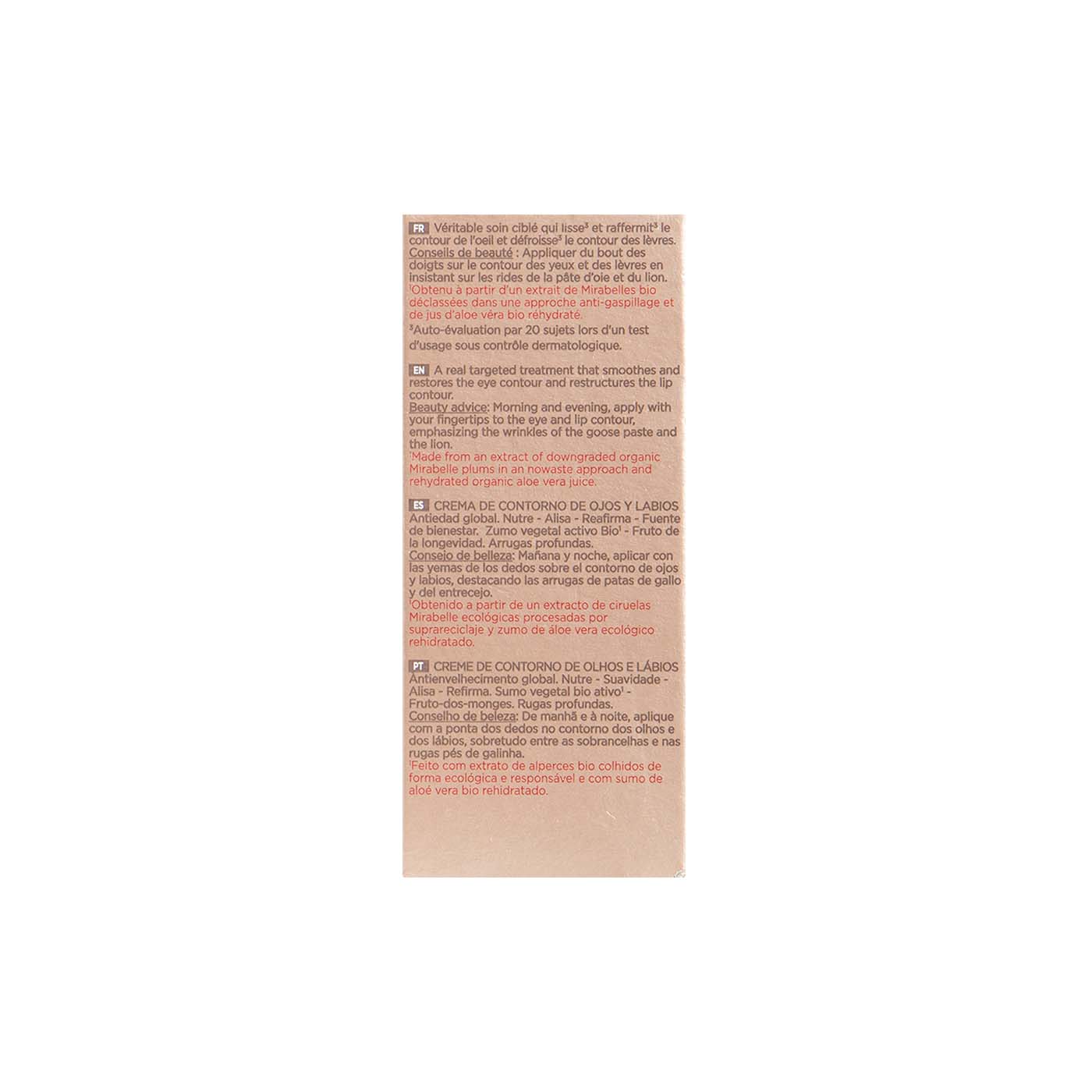 Este tratamiento está destinado a todo tipo de piel, especialmente aquellas que buscan combatir los signos de la fatiga y el envejecimiento en las zonas frágiles del contorno de los ojos y los labios.