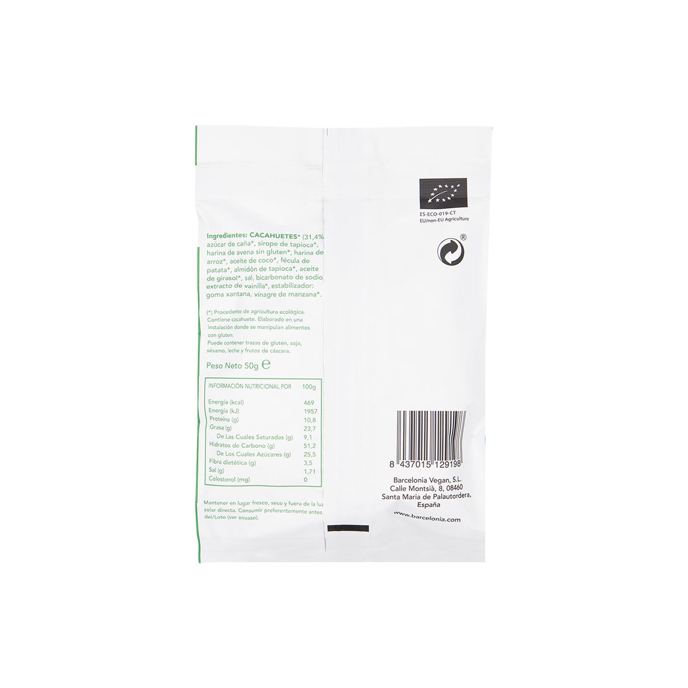 CACAHUETES* (31,4%), azúcar de caña*, sirope de tapioca*, harina de avena sin gluten*, harina de arroz*, aceite de coco*, fécula de patata*, almidón de tapioca*, aceite de girasol*, sal*, bicarbonato de sodio*, extracto de vainilla*, estabilizador: goma xantana*, vinagre de manzana*.