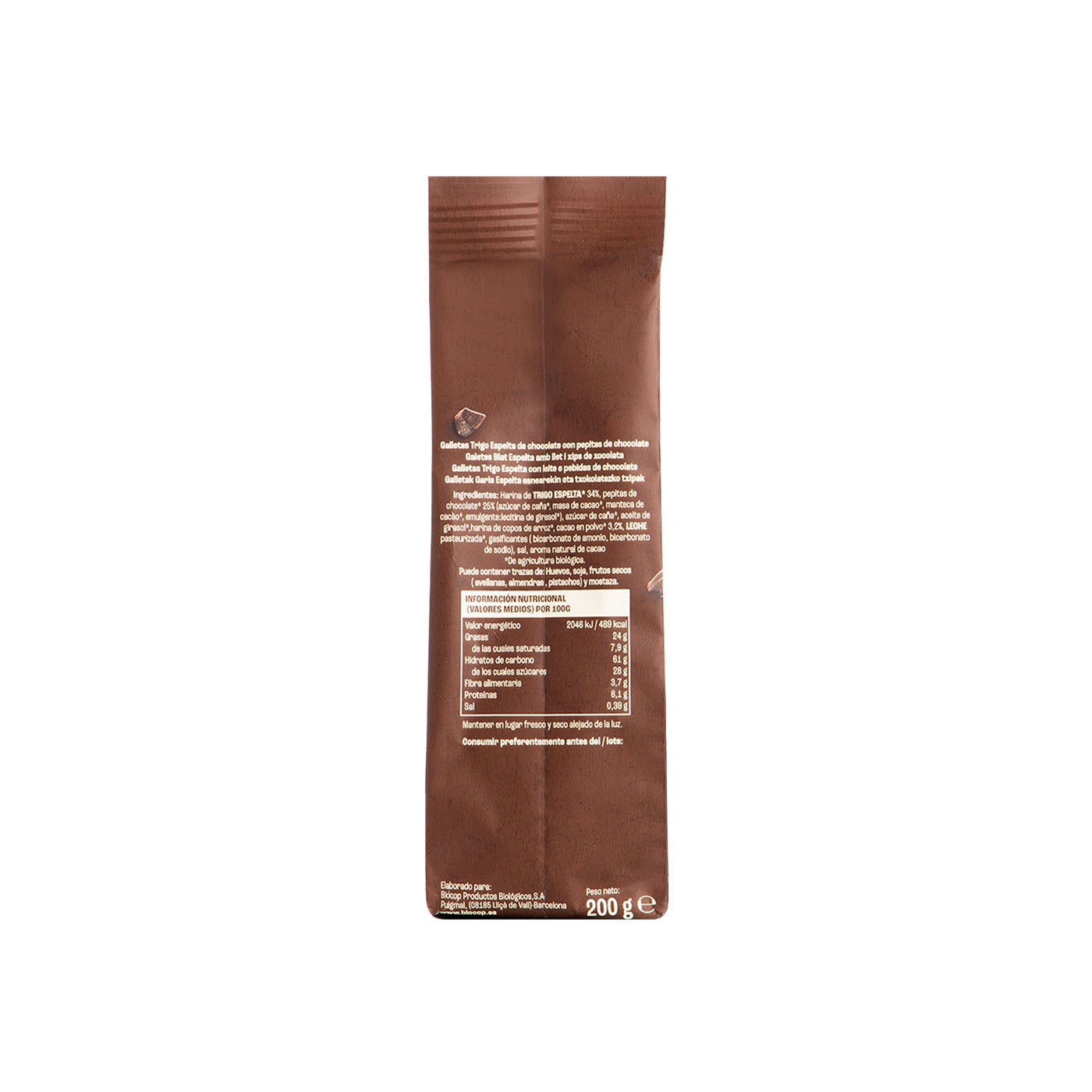 Harina de trigo espelta 34%, pepitas de chocolate 25% (azúcar de caña, masa de cacao, manteca de cacao. Emulsionante: lecitina de girasol), azúcar de caña, aceite de semillas de girasol, harina de copos de arroz , cacao en polvo 3,2%, leche pasteurizada, gasificantes (amonio carbonato ácido, carbonato ácido de sodio), sal , aroma natural de cacao.*De agricultura biologica.