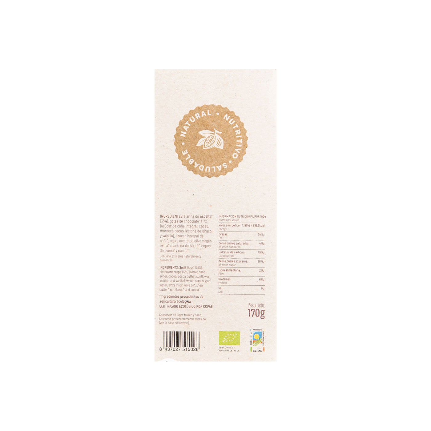 Harina de espelta* (35%), gotas de chocolate* (17%)(azúcar de caña integral, cacao, manteca de cacao, lecitina de girasol, y vainilla), azúcar de caña integral, agua, aceite de oliva virgen extra*, manteca de karité, copos de avena, y cacao.