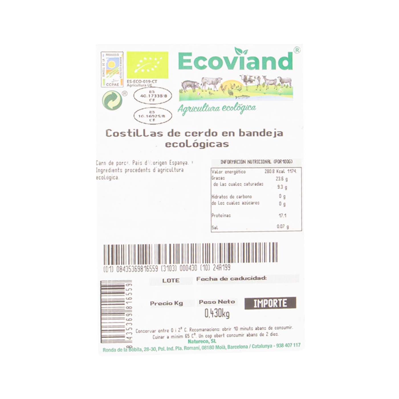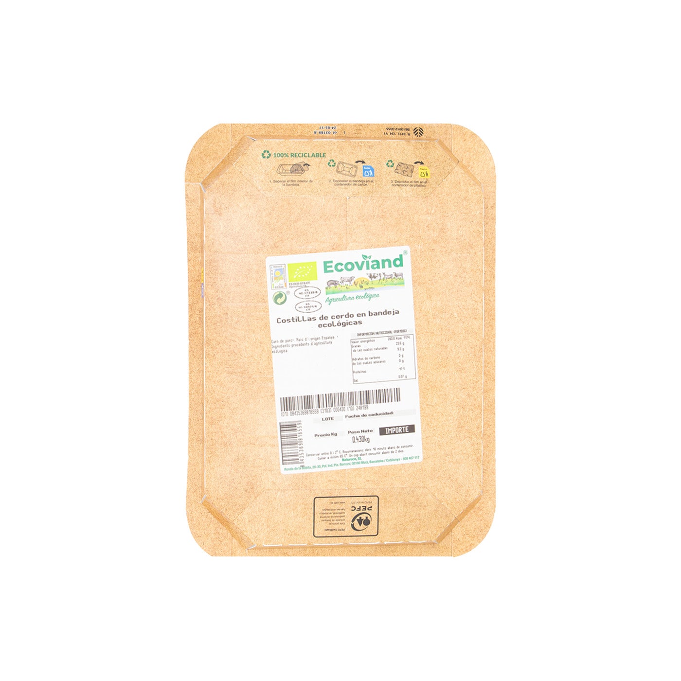 Producto cárnico que consiste en costillas de cerdo de origen ecológico envasadas. La presentación en bandeja facilita su manipulación y conservación antes de su preparación.