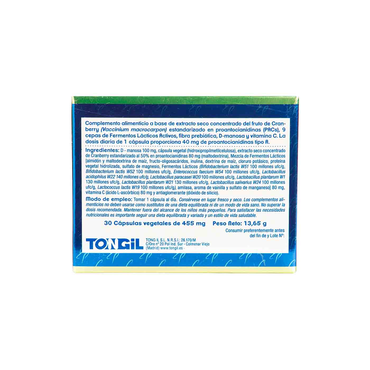 Dosis diaria (1 cápsula): Extracto seco concentrado de Cranberry 80 mg (Contenido en PACs 40 mg); Mezcla de 9 fermentos lácticos activos , 80 mg (80 millones UFC: Bifidobacterium lactis W51 8 millones UFC, Bifidobacterium lactis W52 8 millones UFC, Enterococcus faecium W54 8 millones UFC, Lactobacillus acidophilus W22 11,2 millones UFC, Lactobacillus paracasei W20 8 millones UFC, Lactobacillus plantarum W1 10,4 millones UFC, Lactobacillus plantarum W21 10,4 millones UFC, Lactobacillus salivarius W24 8 millones UFC ,Lactococcus lactis W19 8 millones UFC); D-Manosa 100 mg; Vitamina C 80 mg (100% VRN). VRN: Valores de Referencia de Nutrientes