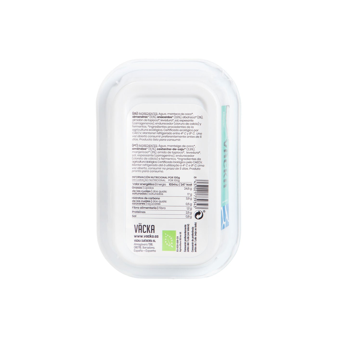 Deliciosa alternativa vegetal al queso cremoso elaborado a partir de anacardos, fermentos y albahaca. Aporta probióticos naturales.
