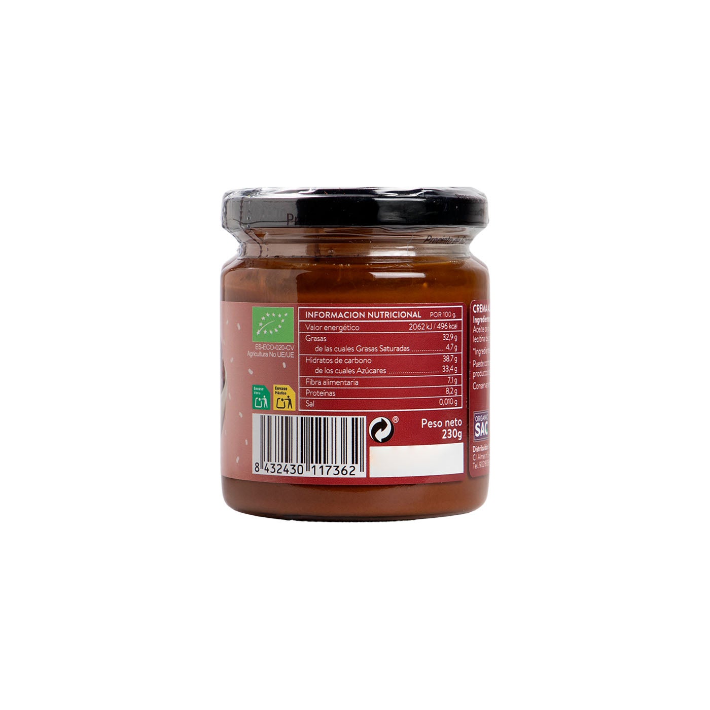 Es una crema untable elaborada a base de dátiles y algarroba, con avellanas y aceite de oliva virgen extra. Este producto, de origen ecológico, se presenta en un práctico frasco de vidrio para su conservación.