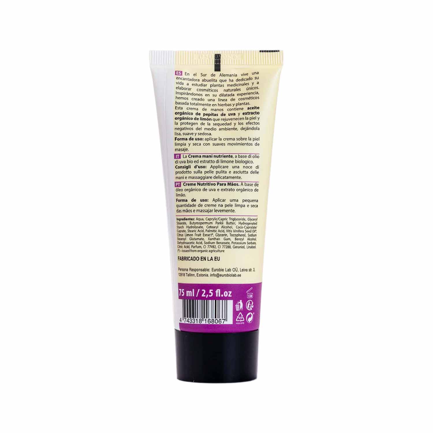 Nuestra crema de manos nutritiva es la solución natural para restaurar y proteger la piel de tus manos de la sequedad y los factores externos. Con ingredientes naturales como el aceite de uva ecológico, rico en antioxidantes, proteínas vegetales, vitaminas A, B, E, F, PP, taninos, y micro y macro elementos, nutrirá y protegerá tus manos de la sequedad y la irritación. Además, el extracto de limón orgánico enriquece la piel con vitamina C, suavizándola y haciéndola aterciopelada. Contiene aceite de semilla de uva, adecuado para pieles grasas, que gracias a sus propiedades nutricionales y regeneradoras, ayudará a mantener la piel saludable.