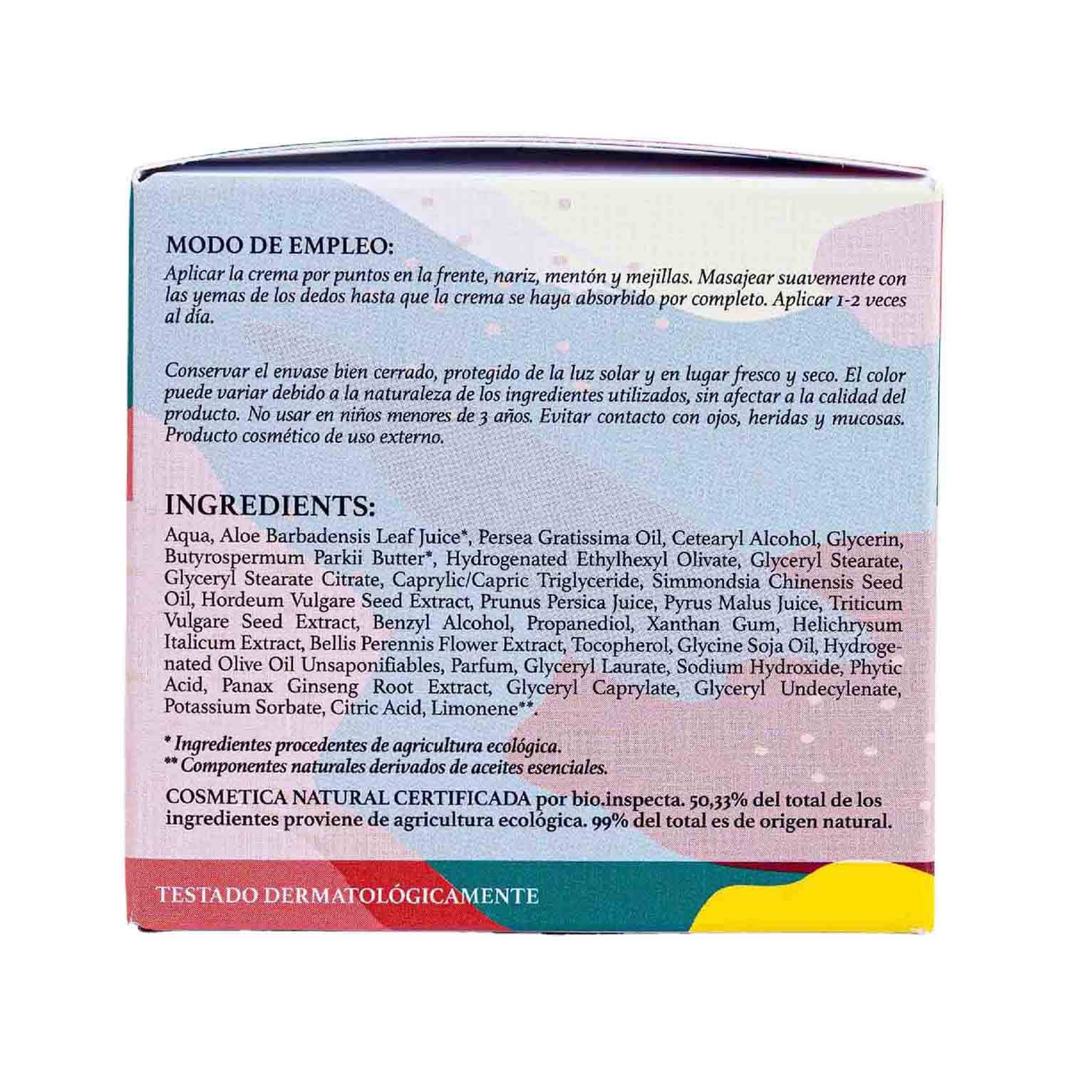 Aqua, Aloe Barbadensis Leaf Juice*, Persea Gratissima Oil, Cetearyl Alcohol, Butyrospermum Parkii Butter, Glycerin, Hydrogenated Ethylhexyl Olivate, Glyceryl Stearate, Glyceryl Stearate Citrate, Caprylic/capric Triglyceride, Simmondsia Chinensis Seed Oil, Hordeum Vulgare Seed Extract, Prunus Persica Juice, Pyrus Malus Juice, Triticum Vulgare Seed Extract, Litsea Cubeba fruit oil, Citrus Aurantium dulcis oil, Benzyl Alcohol, Propanediol, Xanthan Gum, Helichrysum italicum , extract/Bellis perennis flower extract, Tocopherol, Hydrogenated Olive Oil Unsaponifiables, Parfum, Glyceryl Laurate, Sodium Hydroxide, Phytic Acid, Panax Ginseng Root Extract, Glyceryl Caprylate, Glyceryl Undecylenate, Potassium Sorbate, Citric Acid, Limonene**.