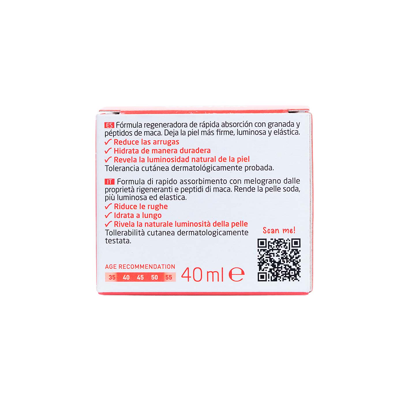 Producto de cuidado facial diseñado para proporcionar una hidratación intensiva y ayudar a reafirmar la piel. Formulada con extracto de granada orgánica y péptidos de maca, esta crema tiene propiedades antioxidantes que ayudan a proteger la piel del envejecimiento prematuro causado por factores ambientales. Esta crema se utiliza durante el día para nutrir la piel, mejorar su elasticidad y dejarla con un aspecto más firme y vital.