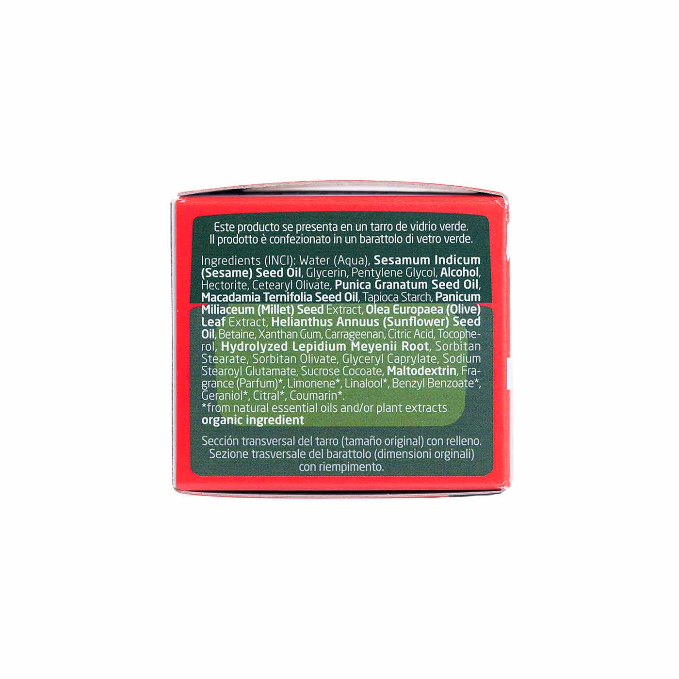 INCI: Water (Aqua), Sesamum Indicum (Sesame) Seed Oil, Glycerin, Pentylene Glycol, Alcohol, Hectorite, Cetearyl Olivate, Punica Granatum Seed Oil, Macadamia Ternifolia Seed Oil, Tapioca Starch, Panicum Miliaceum (Millet) Seed Extract, Olea Europeae (Olive) Leaf Extract, Helianthus Annuus (Sunflower) Seed Oil, Betaine, Xanthan Gum, Carrageenan, Citric Acid, Tocopherol, Hydrolyzed Lepidium Meyenii Root, Sorbitan Stearate, Sorbitan Olivate, Glyceryl Caprylate, Sodium Stearoyl Gluatamate, Sucrose Cocoate, Maltodextrin, Fragrance (Parfum)*, Limonene*, Linalool*, Benzyl Benzoate*, Geraniol*, Citral*, Coumarin*. *De aceites esenciales naturales.