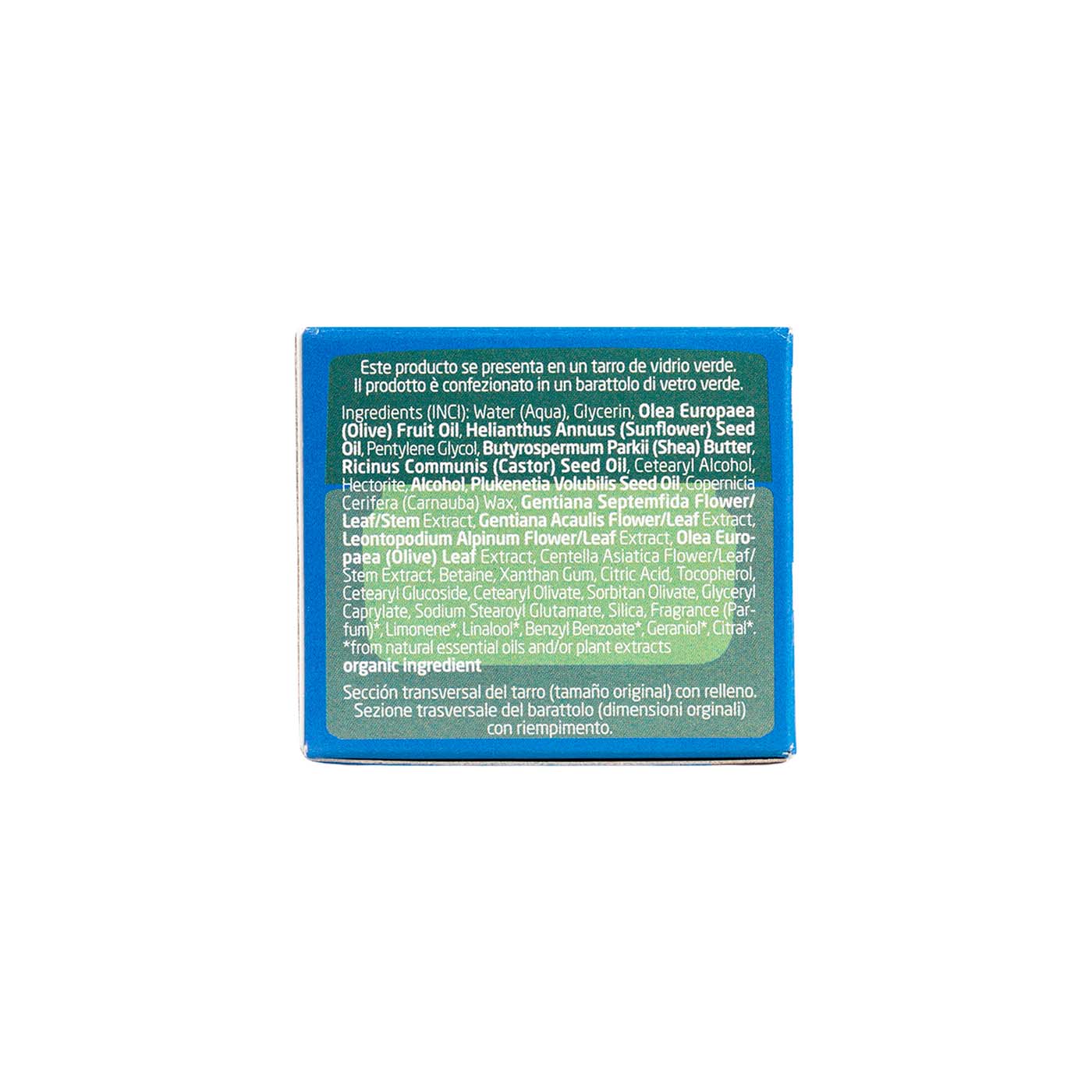 INCI: Water (Aqua), Glycerin, Olea Europaea (Olive) Fruit Oil, Helianthus Annuus (Sunflower) Seed Oil, Pentylene Glycol, Butyrospermum Parkii (Shea) Butter, Ricinus Communis (Castor) Seed Oil, Cetearyl Alcohol, Hectorite, Alcohol, Plukenetia Volubilis Seed Oil, Copernicia Cerifera (Carnauba) Wax, Gentiana Septemfida Flower/Leaf/Stem Extract, Gentiana Acaulis Flower/Leaf Extract, Leontopodium Alpinum Flower/Leaf/Stem Extract, Olea Europeae (Olive) Leaf Extract, Centella Asiatica Flower/Leaf/Stem Extract, Betaine, Xanthan Gum, Citric Acid, Tocopherol, Cetearyl Glucoside, Cetearyl Olivate, Sorbitan Olivate, Glyceryl Caprylate, Sodium Stearoyl Gluatamate, Silica, Fragrance (Parfum)*, Limonene*, Linalool*, Benzyl Benzoate*, Geraniol*, Citral*. *De aceites esenciales naturales.