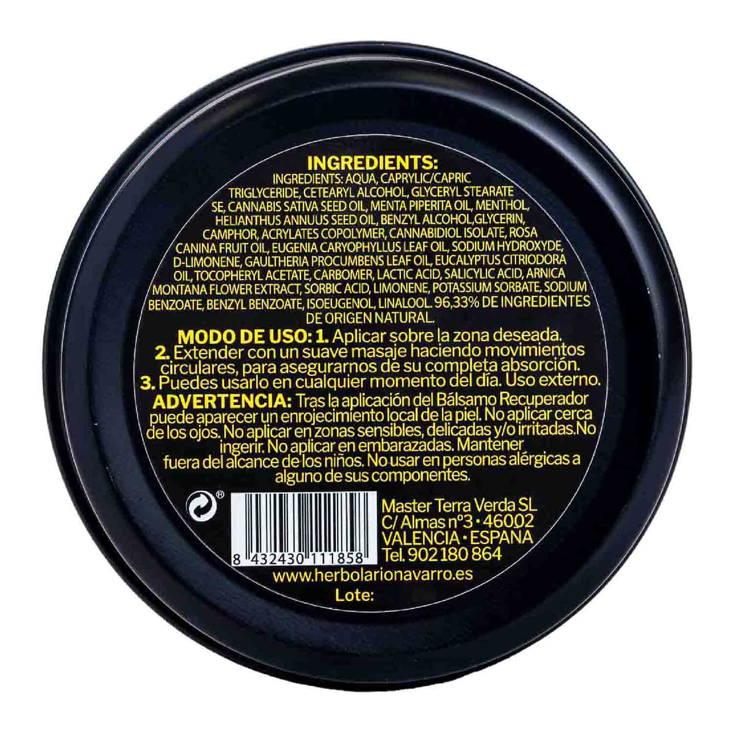 Crema de masaje efecto frío con CBD de Herbolario Navarro. Bálsamo de CBD corporal de efecto frío para activar tu cuerpo y tu bienestar. Gracias a su contenido en CBD y extractos vegetales como la miel, el árnica o la menta, actúa de forma localizada, por lo que es perfecta para aplicar después de un esfuerzo deportivo o cotidiano. Este producto cumple con la normativa española de no superación del 0,2% de THC.