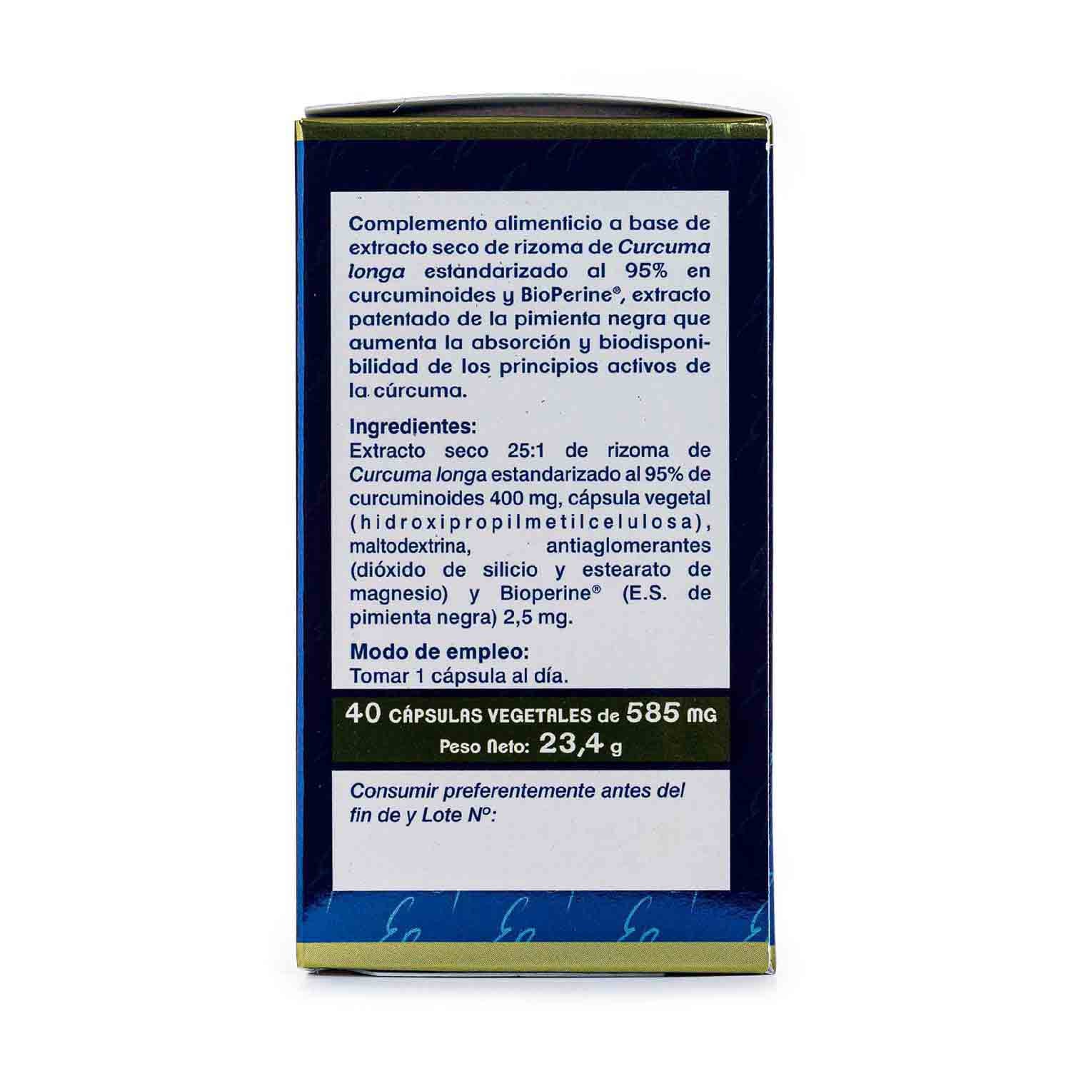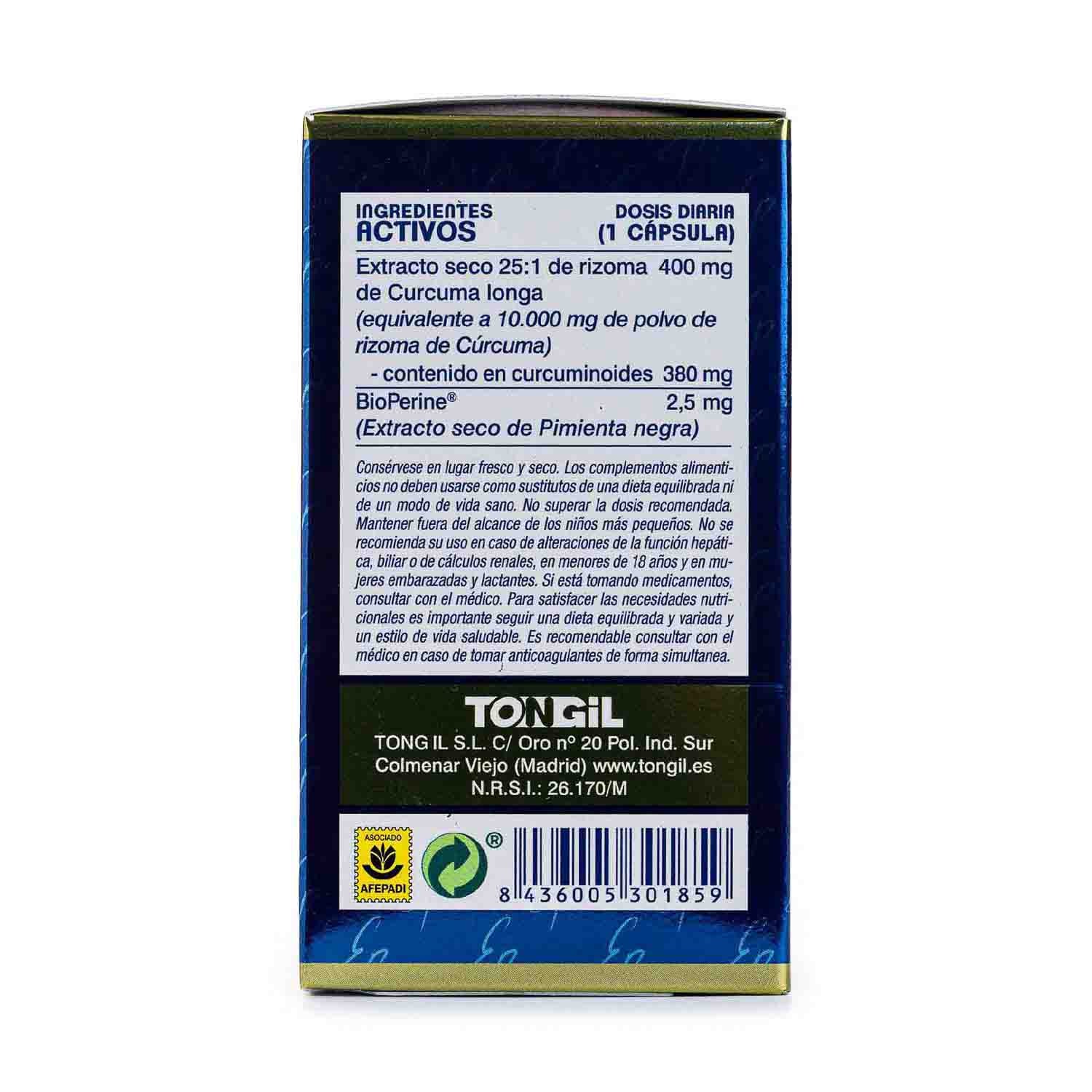 Cúrcuma 10.000mg. en cápsulas de Tongil. Extracto seco concentrado 25:1 de rizoma de Cúrcuma longa, estandarizado al 95% en curcuminoides La Cúrcuma: Contribuye a la función del sistema nervioso, mantiene la salud del hígado, pulmones y vías respiratorias superiores. Promueve la producción y calidad de la sangre. Ayuda al funcionamiento del sistema inmunitario, la resistencia a las alergias y tiene propiedades antioxidantes. Contribuye a aliviar los dolores inflamatorios, musculares y articulares.