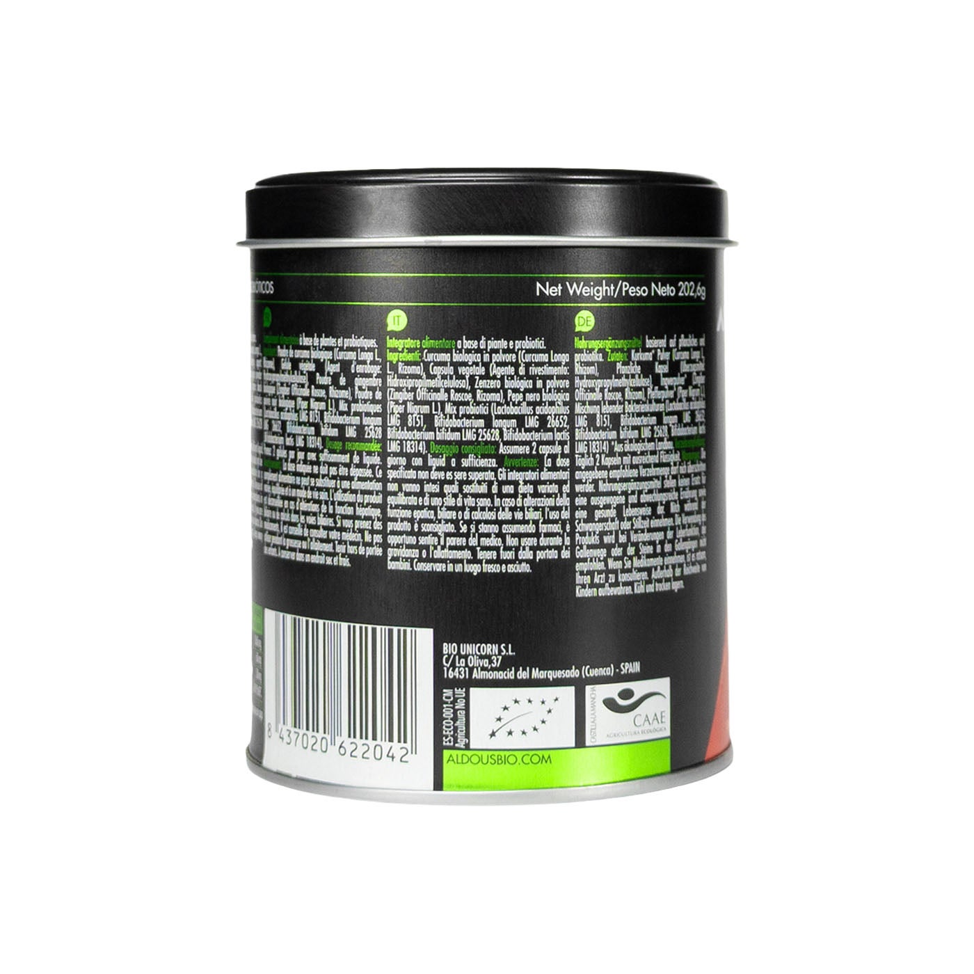 La fórmula avanzada de Aldous Bio añade un mix de probióticos al extracto puro de cúrcuma en polvo con jengibre y pimienta negra, que potencia la efectividad para detoxificar y estimular el metabolismo, e incrementa el poder antiinflamatorio y antioxidante de formulaciones básicas de cúrcuma sin probiótico, obteniendo mejores resultados en personas con problemas digestivos o dolores articulares. Advertencias: No superar la dosis diaria recomendada. Mantener fuera del alcance de los niños más pequeños. Los complementos alimenticios no deben utilizarse como sustituto de una dieta variada y equilibrada ni de un estilo de vida saludable. Conservar en lugar fresco y seco.