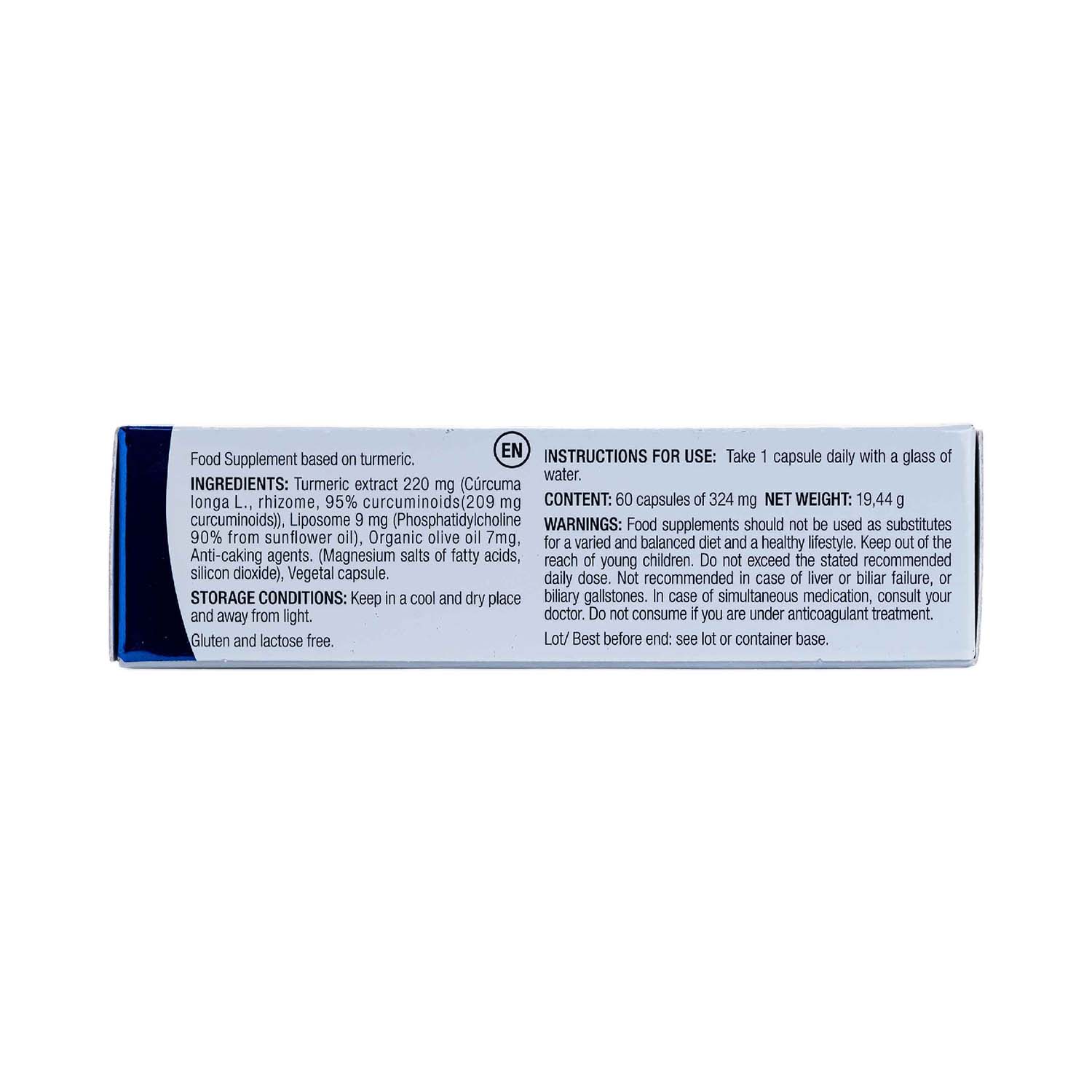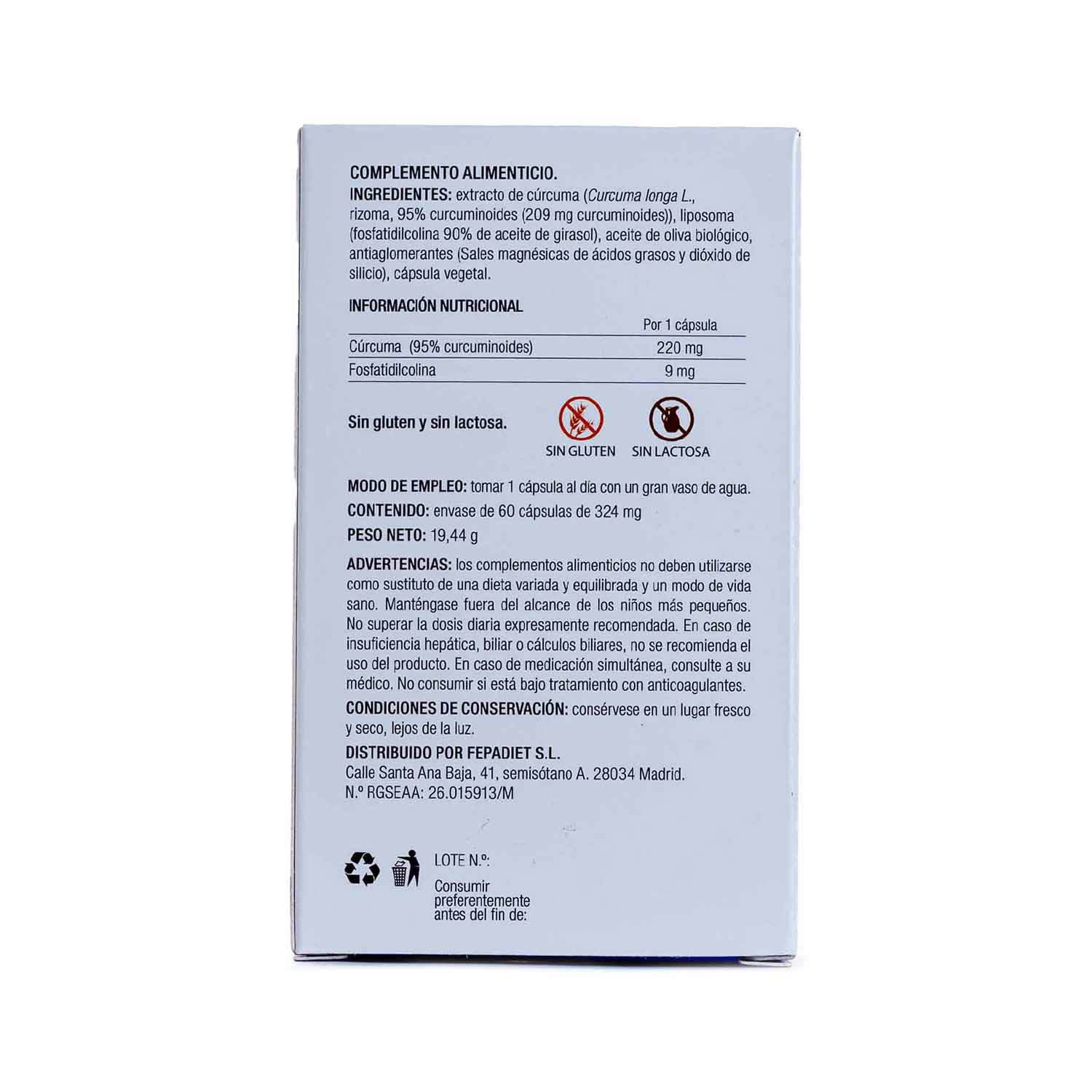 Complemento alimenticio que contiene extracto de cúrcuma (Curcuma longa) estandarizado al 95% de curcuminoides, encapsulado en liposomas de fosfatidilcolina derivada del aceite de girasol.
