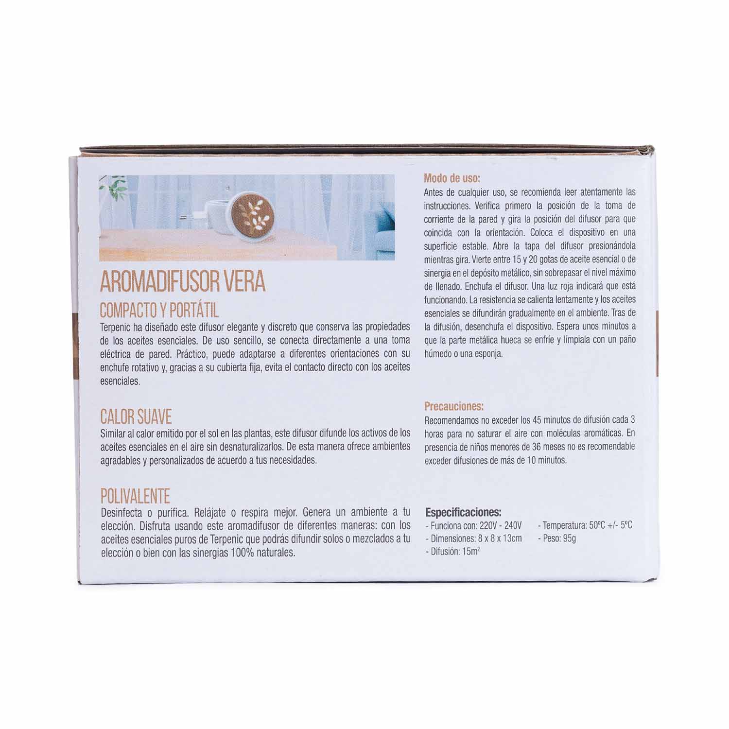https://www.herbolarionavarro.es/difusor-electrico-de-aromas-vera-terpenic82972Difusor Eléctrico de Aromas Vera Terpenic<h2>¿Qué es el Difusor Eléctrico de Aromas Vera de Terpenic?</h2><p>Es un difusor de aceites esenciales portátil, práctico y compacto. Presenta un diseño elegante y discreto para conectar en una toma eléctrica de pared y disfrutar de tu aroma favorito. Además, también desinfecta y purifica el ambiente. No necesita agua y difunde hasta 15m2.</p><h2>¿De qué consta el Difusor Eléctrico de Aromas Vera de Terpenic?</h2><p>El Difusor Vera tiene un diseño elegante y fino. Consta de un práctico enchufe rotativo, de una base o depósito metálico para los aceites esenciales y de una tapa fija para evitar el contacto directo con los aceites. </p><h2>¿Cuál es su mecanismo de acción?</h2><p>Al conectarse a la red eléctrica emite un calor similar al que genera el sol en las plantas, lo que hace que este difunda los principios activos de los aceites esenciales en el ambiente sin llegar a desnaturalizarlos. Es decir, mantiene todas las propiedades de los aceites esenciales depositados en este. La resistencia se calienta lentamente, difundiendo el aroma gradualmente. Además de generar un ambiente personalizado en la estancia que desees, desinfecta o purifica el aire. Podrás disfrutar de un sólo aceite esencial o de la mezcla y sinergia creada entre ellos, creando tus propios aromas personalizados 100% naturales.</p><h2>Modo de empleo</h2><ol><li><p>En primer lugar, orienta el enchufe rotativo a tu toma de luz eléctrica de pared.</p></li><li><p>Colocar el difusor sobre una superficie plana y estable.</p></li><li><p>Abrir la tapa presionandola ligeramente mientras gira.</p></li><li><p>Verter entre 15-20 gotas del aceite esencial seleccionado en el depósito, sin sobrepasar el nivel indicado, y tapar de nuevo.</p></li><li><p>Enchufar el difusor a la luz.</p></li><li><p>Tras la difusión del aroma, desenchufar el aparato.</p></li><li><p>Esperar a que la parte metálica hueca se enfríe y limpiarla con un trapo húmedo o esponja.</p></li></ol><h2>Advertencias</h2><p>Se recomienda no sobrepasar los 45 minutos de difusión cada 3 horas para no saturar el ambiente con partículas aromáticas. No se recomienda exceder en más de 10 minutos la difusión con niños menores de 36 meses.</p><h2>Caracteríscicas específicas del producto</h2><ul><li><p>Funciona con :220V-240V</p></li><li><p>Dimensiones: 8x8x13cm</p></li><li><p>Difusión: 15m2</p></li></ul>https://www.herbolarionavarro.es/media/catalog/product/9/9/99720683_1.jpg26.28instock026.2821.71900726446300Terpenic Labs242https://www.herbolarionavarro.es/media/catalog/product/9/9/99720683_1.jpg/Enamórate/Aceites esenciales naturales/Hogar y mascotas/Hogar y mascotas/Aromaterapia y aromatizantes/Hogar y mascotas/Aromaterapia y aromatizantes/Ambientadores/Terpenic Labs2023-03-21T12:08:05+00001, 81