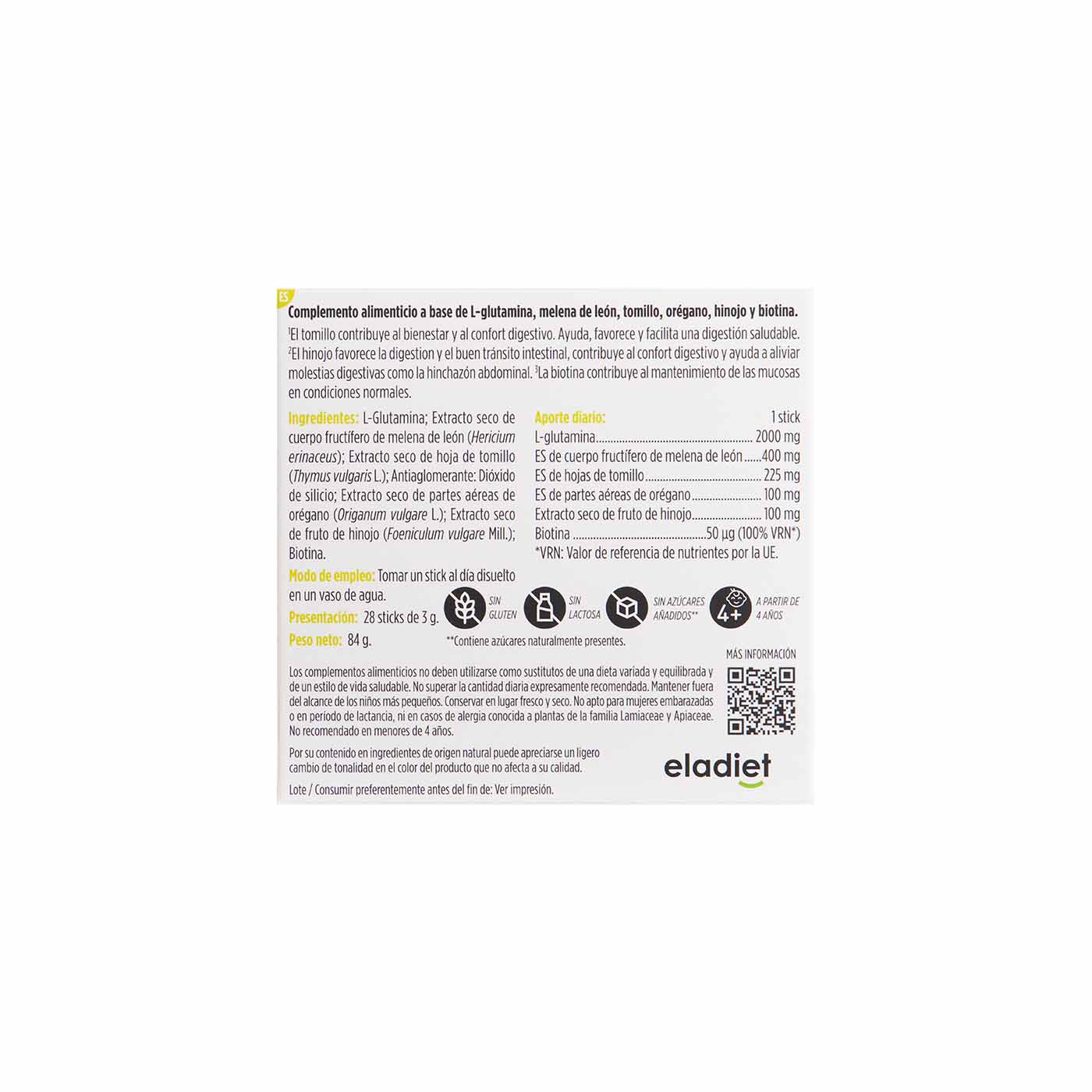 Complemento alimenticio en formato stick o sobre diseñado para el bienestar digestivo, elaborado con una combinación de ingredientes naturales cuidadosamente seleccionados. Su fórmula incluye L‑glutamina, extracto seco de melena de león (Hericium erinaceus), tomillo (Thymus vulgaris L.), orégano (Origanum vulgare L.), hinojo (Foeniculum vulgare Mill.) y biotina.