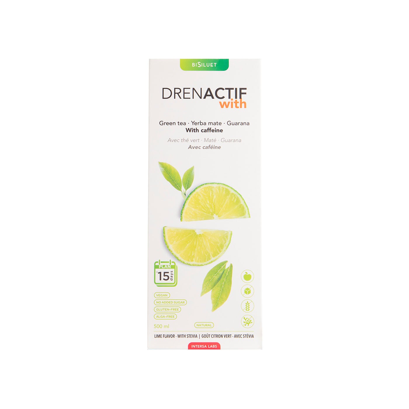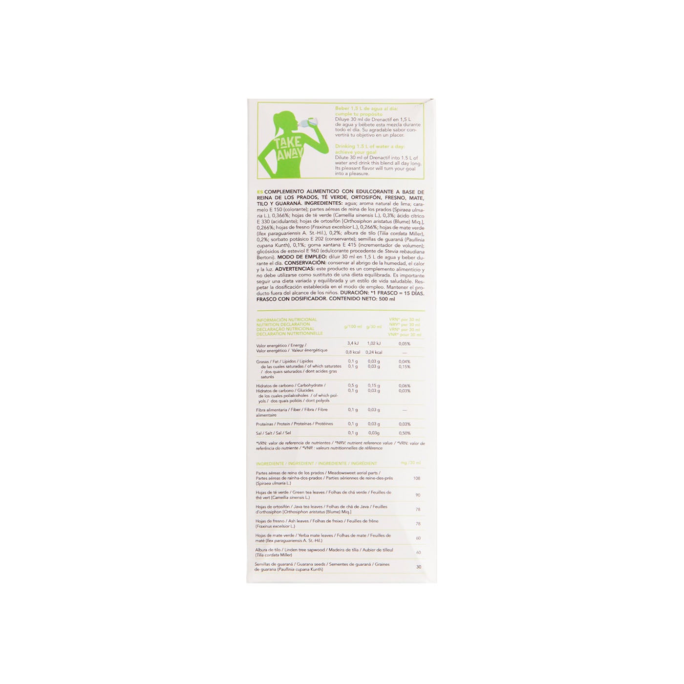 DrenActif es un complemento alimenticio vegano elaborado con fitonutrientes 100% naturales entre los cuales se encuentran: té verde, mate y guaraná. Además, tiene un delicioso sabor a lima sin azúcares añadidos.