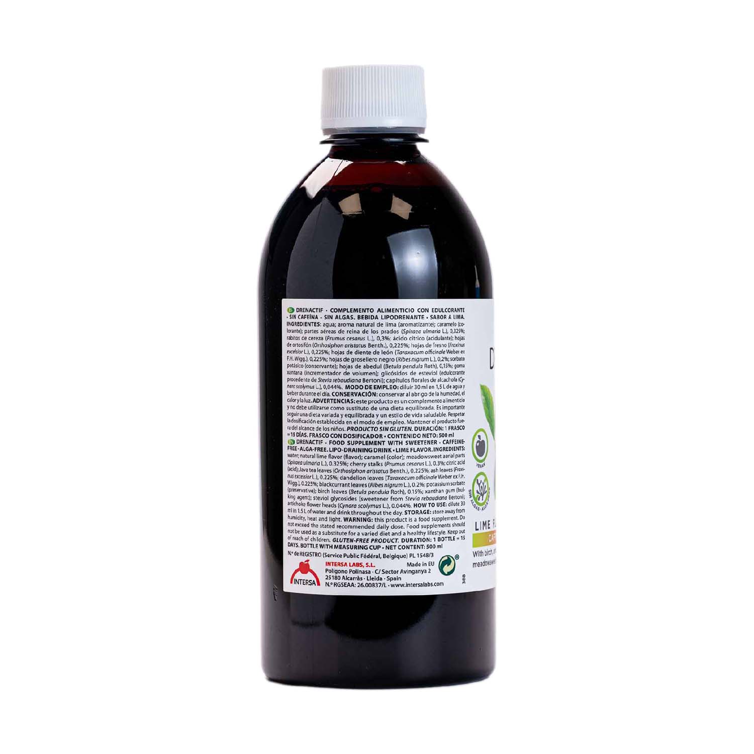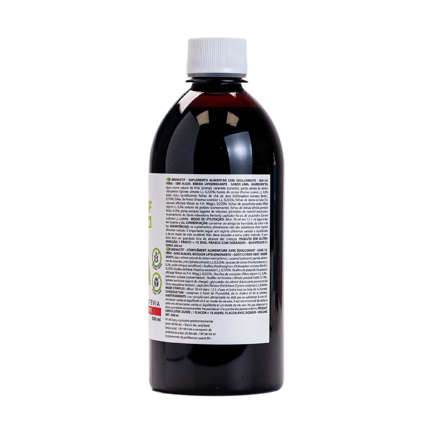 DrenActif SIN es un complemento alimenticio vegano a base de fitonutrientes 100% natural con un refrescante sabor a lima, edulcorado con stevia, sin algas y sin cafeína.