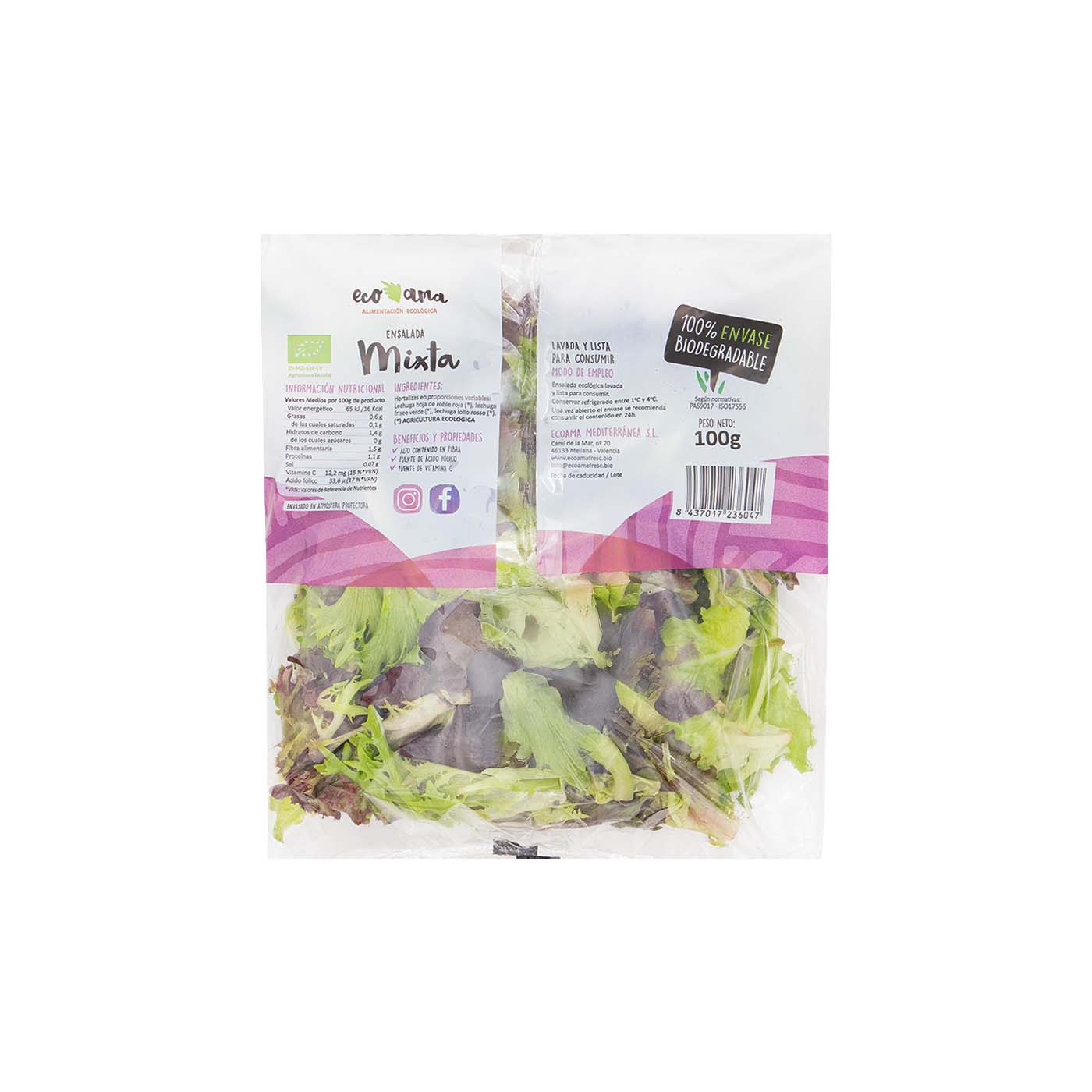 Saborea la fresca y crujiente Ensalada Mixta de Ecoama. Con alto contenido en fibra, fuente de ácido fólico y vitamina C para tu nutrición diaria.