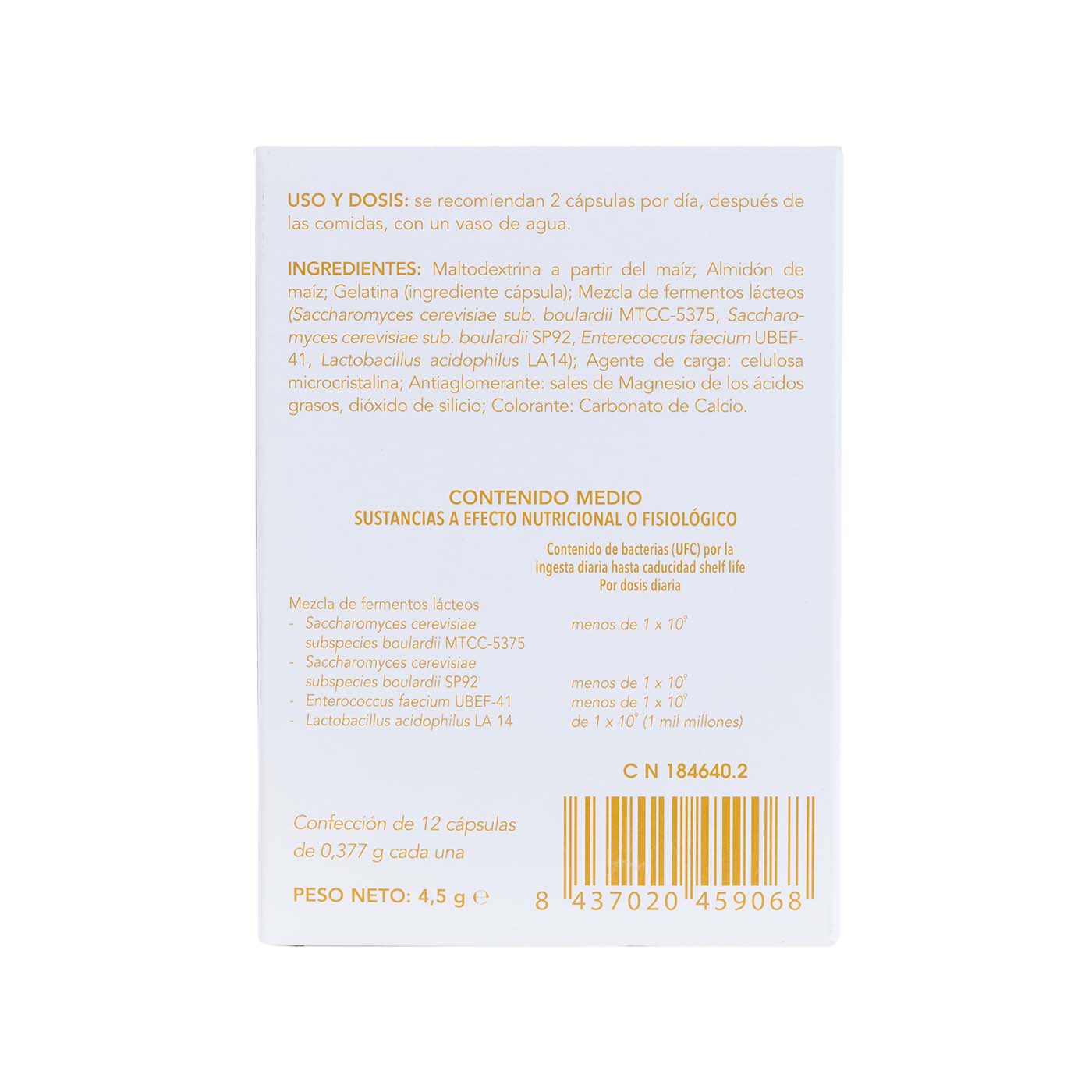 Complemento alimenticio que contiene una mezcla de fermentos lácteos (Saccharomyces cerevisiae sub. boulardii MTCC-5375, Saccharomyces cerevisiae sub. boulardii SP92, Enterococcus faecium UBEF-41, Lactobacillus acidophilus LA14), también conocidos como probióticos, formulados para contribuir a la salud intestinal.