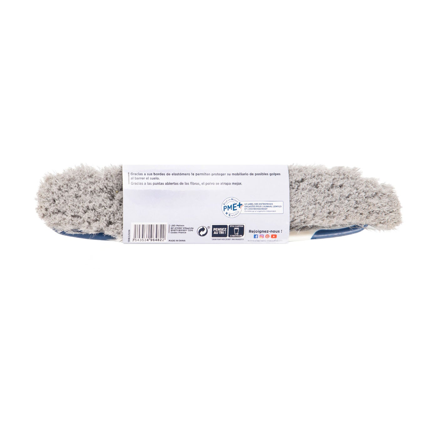Es una escoba diseñada para proteger tus muebles mientras limpias, gracias a sus bordes de elastómero que amortiguan los golpes. Sus fibras flexibles y reactivas, hechas con un 30% de PET reciclado, son perfectas para barrer todo tipo de suelos. Estas fibras están floreadas, es decir, tienen puntas ligeramente bifurcadas para recoger eficazmente hasta el polvo más fino, proporcionando una limpieza más completa y cuidadosa.
