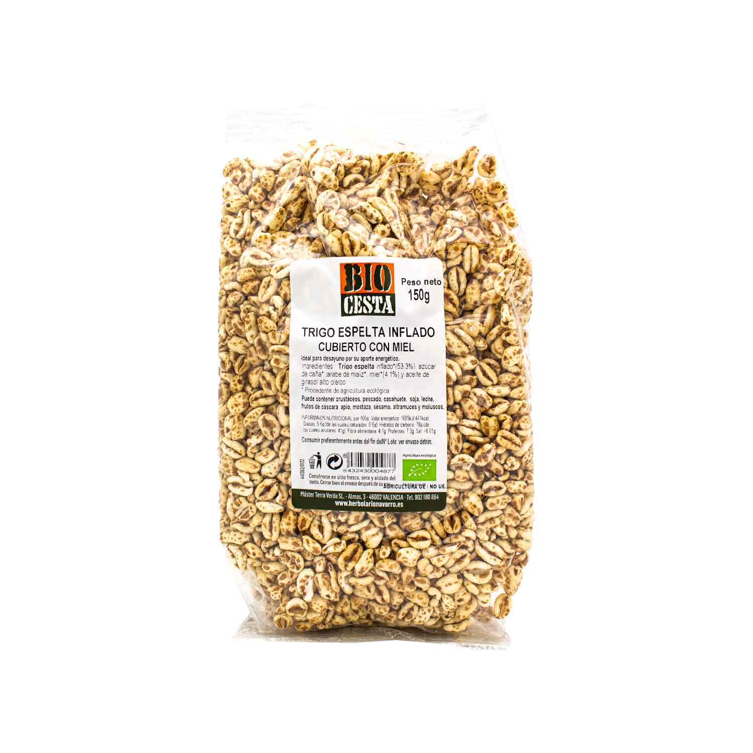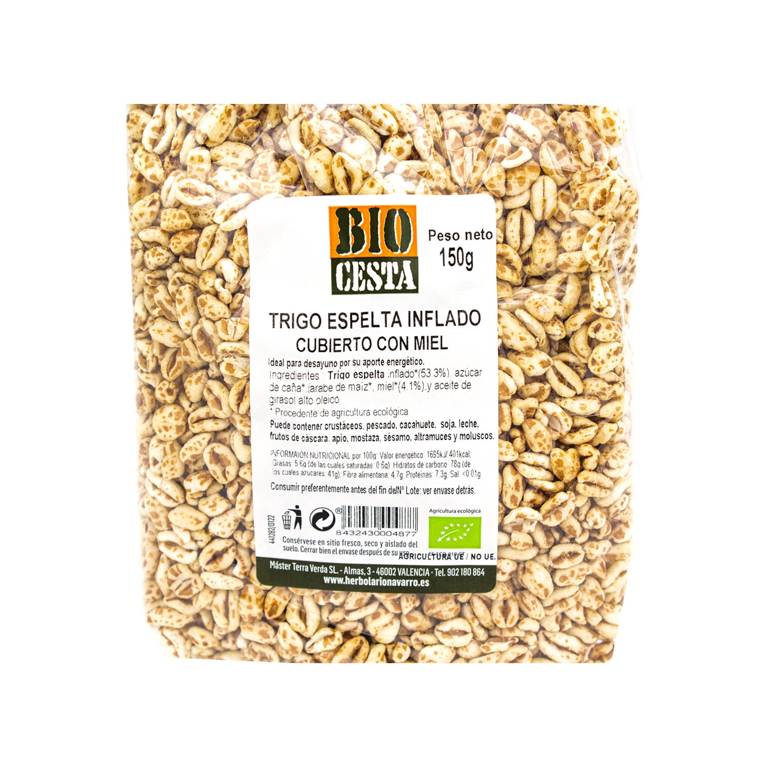 Trigo espelta inflado* (53,3%), azucar de caña*, jarabe de maíz*, miel* (4,1%), y aceite de girasol alto oleico. *Procedente de agricultura ecológica.