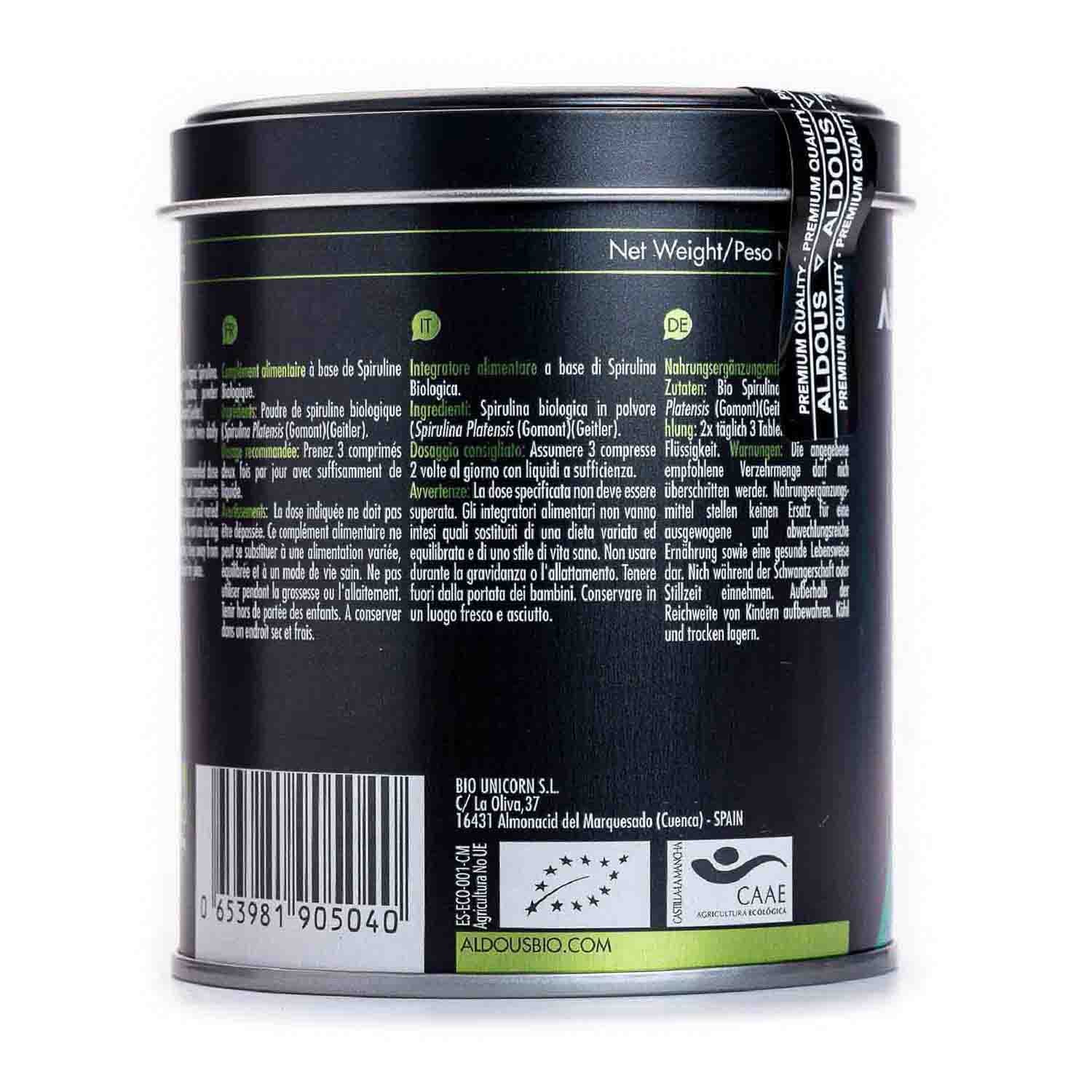 La espirulina de Aldous es un producto ecológico con certificación oficial, producido honestamente, ético, sostenible y envasado sin plástico y cultivada en el mejor entorno natural. Con agua de gran pureza y libre de residuos tóxicos procedentes de pesticidas, antibióticos, fertilizantes sintéticos, aditivos y conservantes. El secado realizado garantiza la conservación de las excelentes propiedades nutricionales de nuestra Espirulina orgánica.