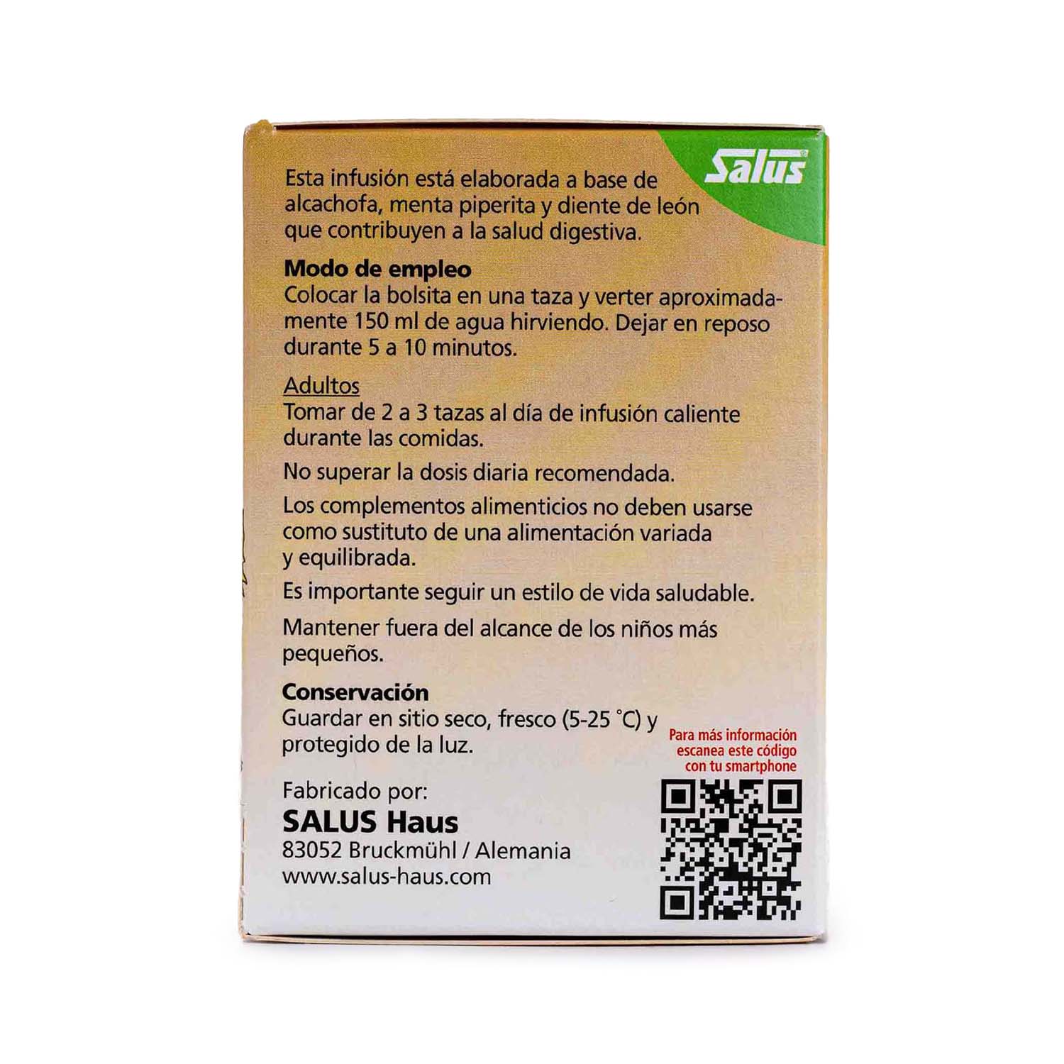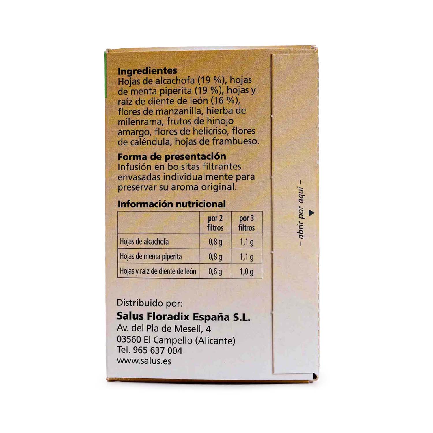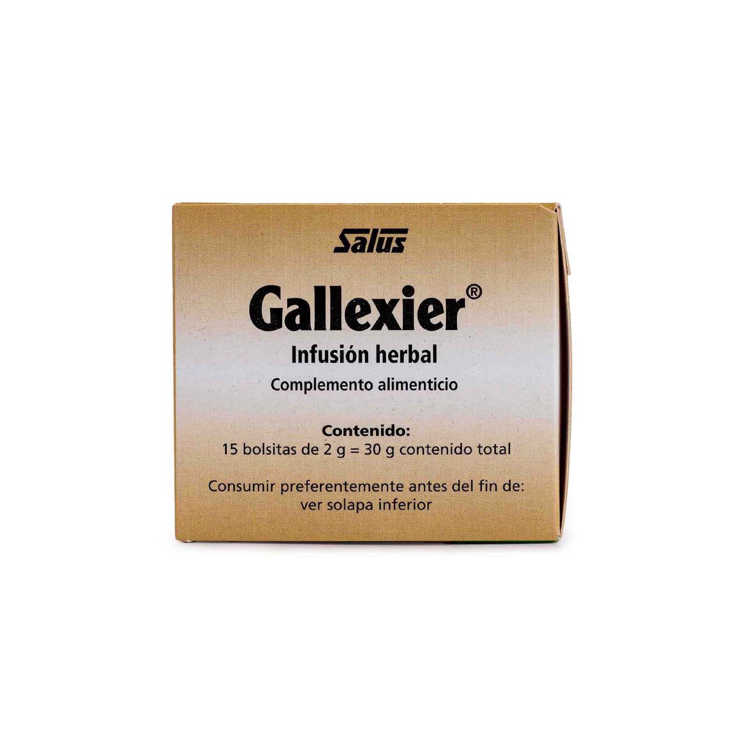 La infusión Gallexier de Salus está elaborada a base de alcachofa, menta piperita y diente de león que contribuyen a una buena salud digestiva así como manzanilla, milenrama, hinojo amargo, helicriso, caléndula y frambueso.