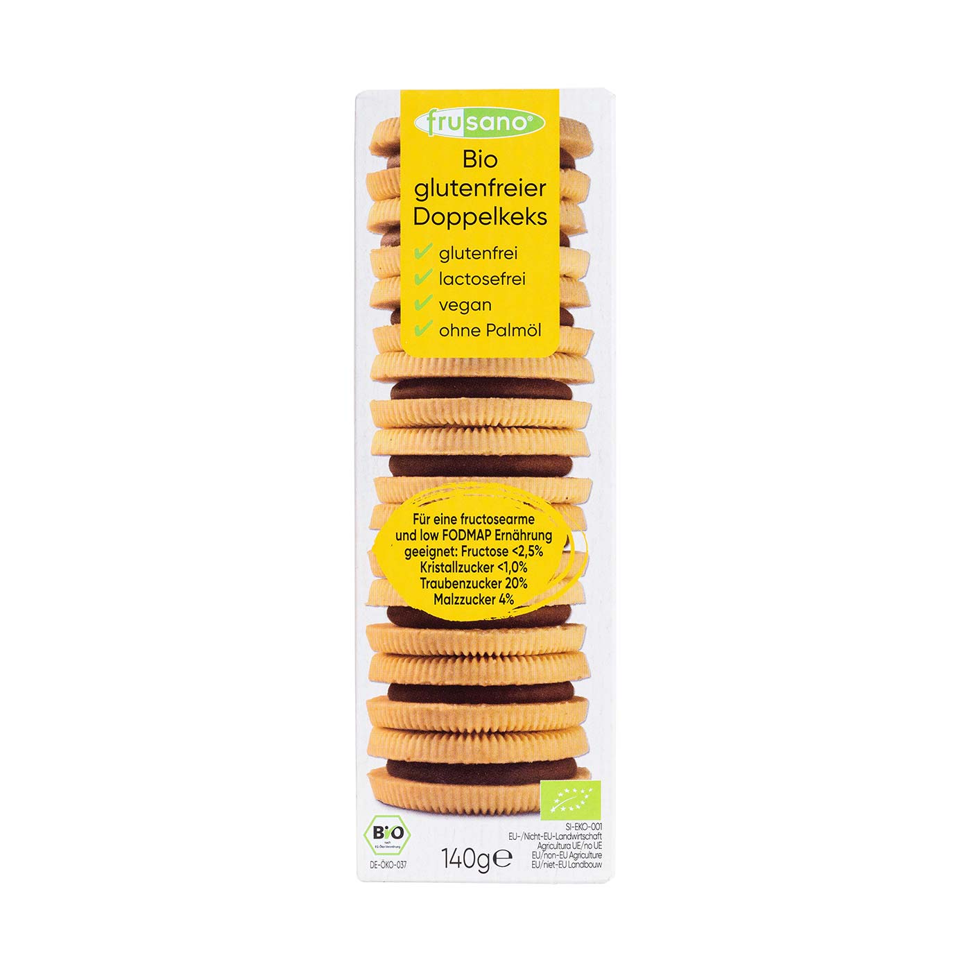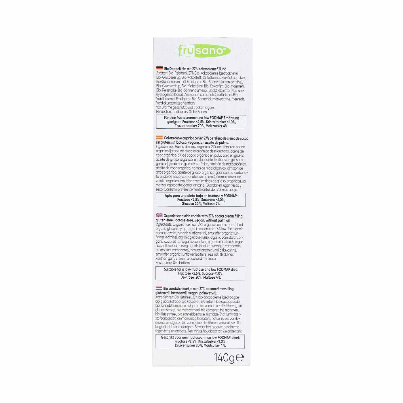 Las Galletas de Espelta Doble con Chocolate sin Fructosa de Frusano son un producto elaborado especialmente para satisfacer a las personas que buscan opciones de galletas con chocolate sin la presencia de fructosa añadida. Apto para una dieta baja en fructosa y FODMAP: Fructosa <2,5%, Sacarosa <1,0%, Glucosa 20%, Maltosa 4%.
