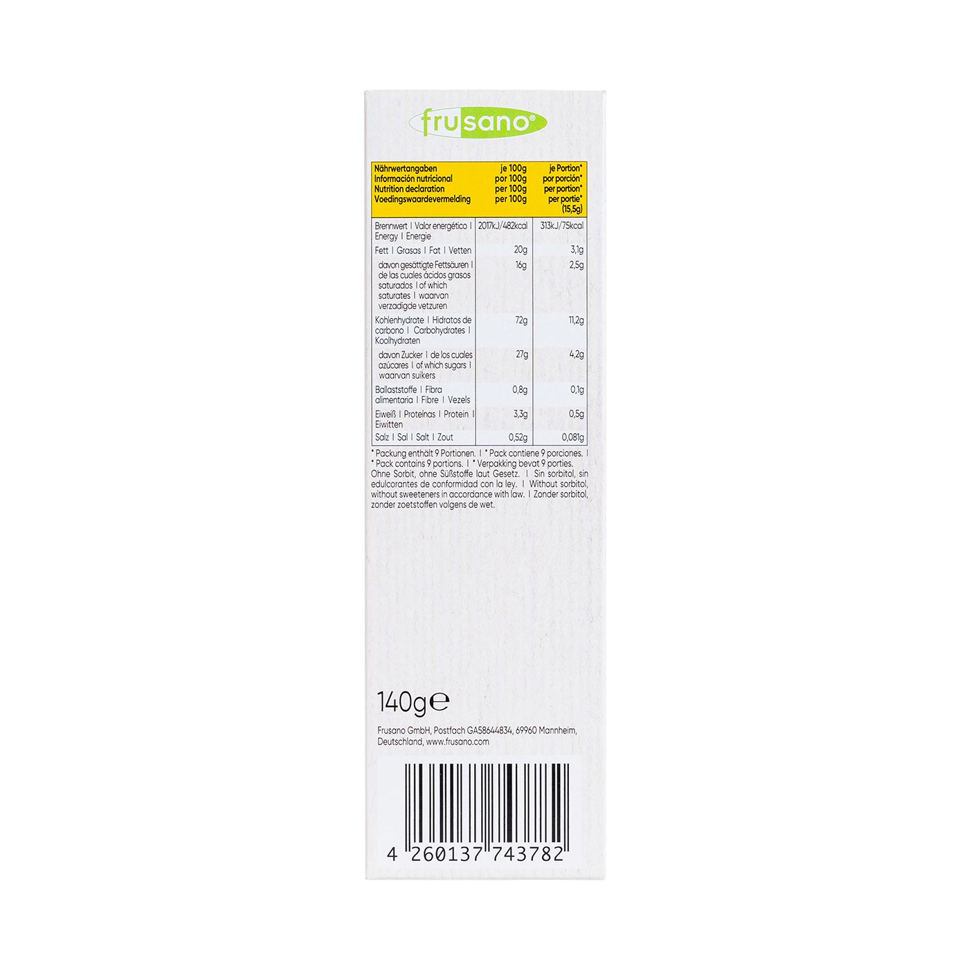 Harina de arroz orgánico, 27% de crema de cacao orgánico (jarabe de glucosa orgánica deshidratado (>información sobre el jarabe de glucosa), aceite de coco orgánico, 6% de cacao orgánico en polvo bajo en grasas, aceite de girasol orgánico, emulsionante: lecitinas de girasol orgánicas), jarabe de glucosa orgánico (>jarabe de glucosa), almidón de maíz orgánico, aceite de coco orgánico, harina de maíz orgánico, almidón de arroz orgánico, aceite de girasol orgánico, gasificantes (carbonato ácido de sodio, carbonatos de amonio), aroma natural de vainilla orgánica, emulsionante: lecitinas de girasol orgánicas, sal marina, espesante: goma xantana.