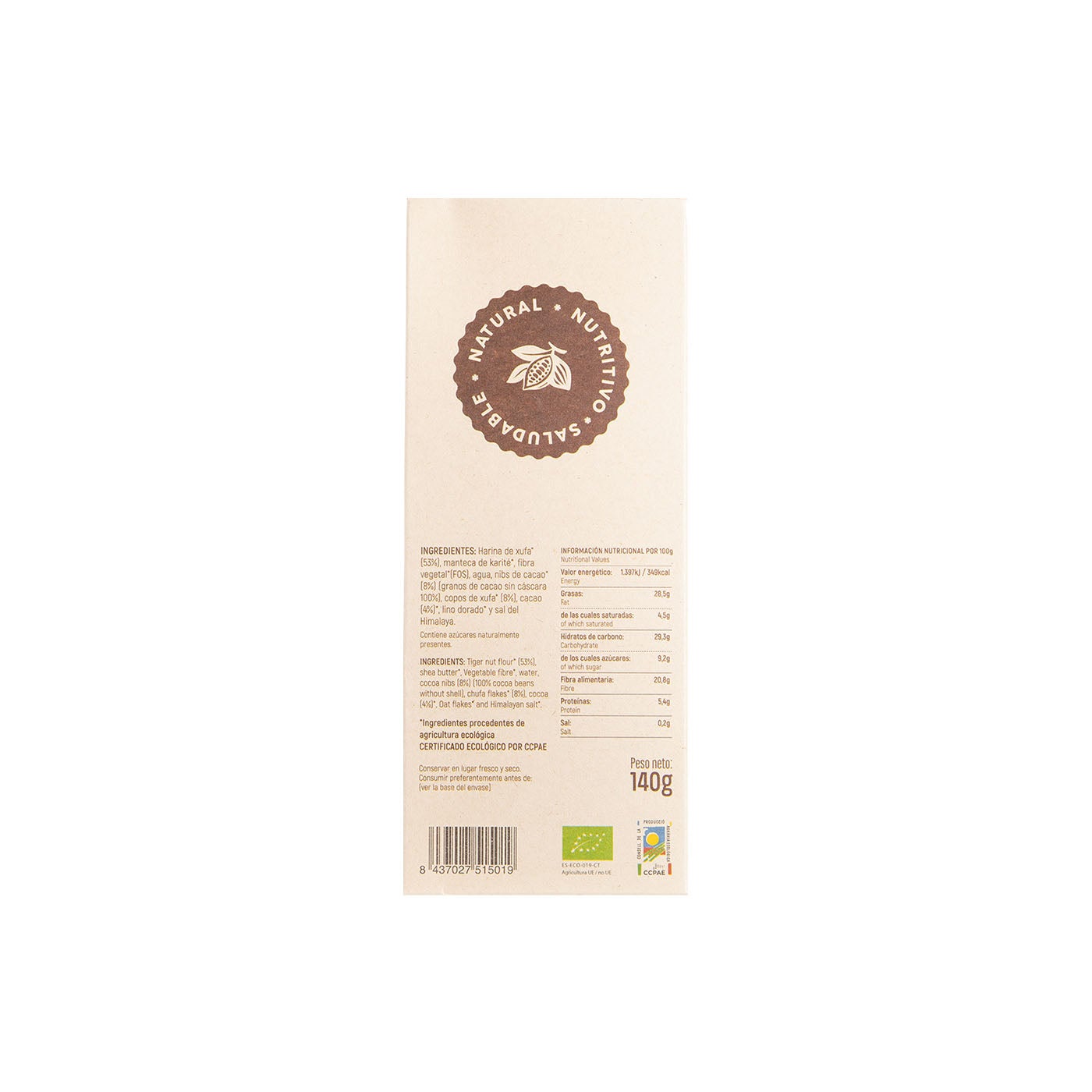 Harina de chufa* (53%), manteca karité, fibra vegetal* (FOS), agua, nibs de cacao* (8%), (granos de cacao sin cáscara 100%), copos de chufa* (8%), cacao (4%), lino dorado*y sal del Himalaya.