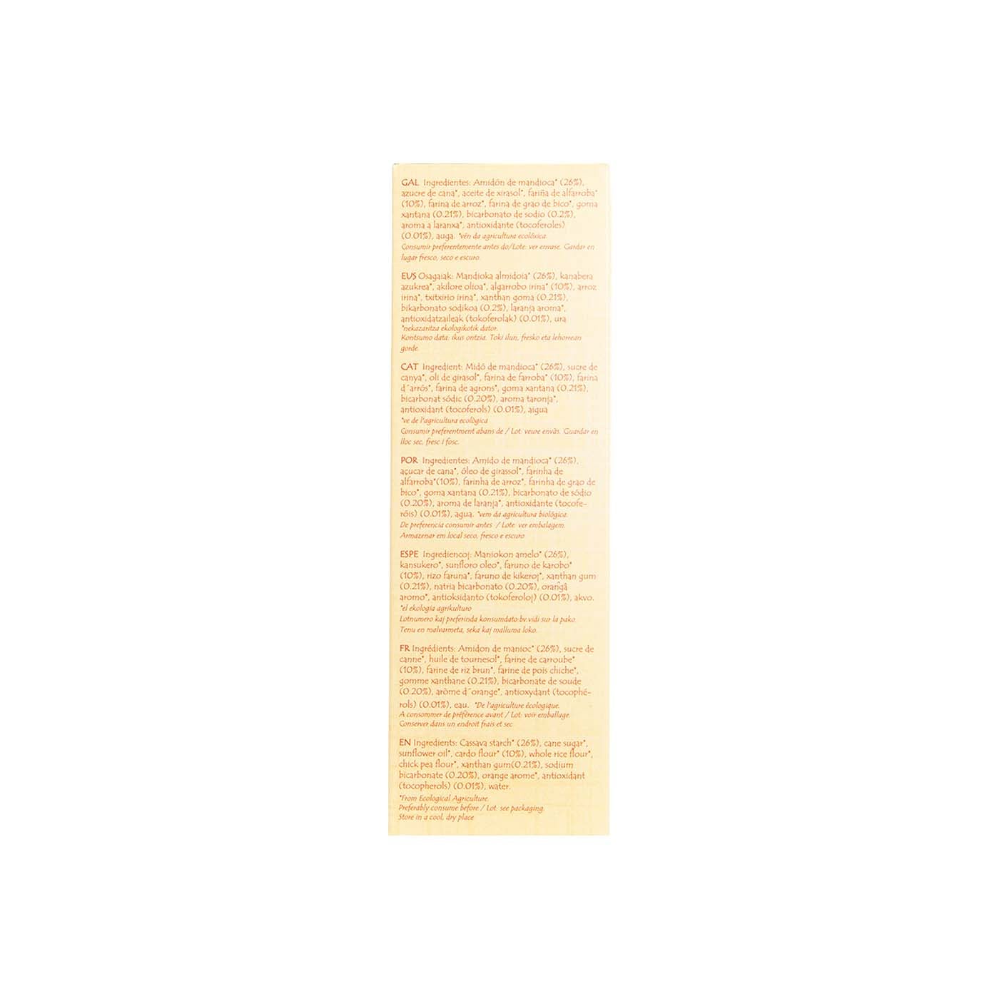 Almidón de mandioca*, harina de algarroba* (12%), harina de garbanzos*, harina de arroz integral*, azúcar de caña*, agua, aceite de girasol*, gasificate: bicarbonato sódico, espesante: goma xantana. *Procedente de agricultura ecológica.