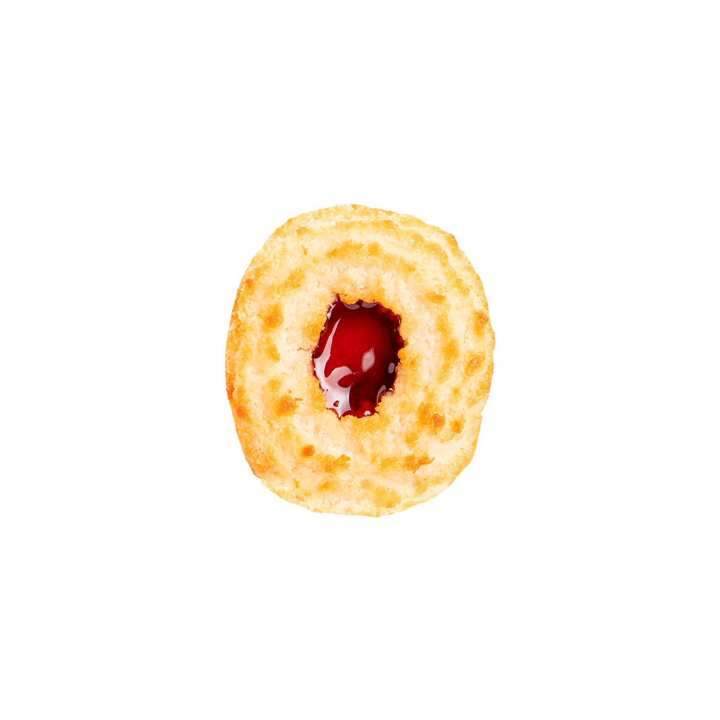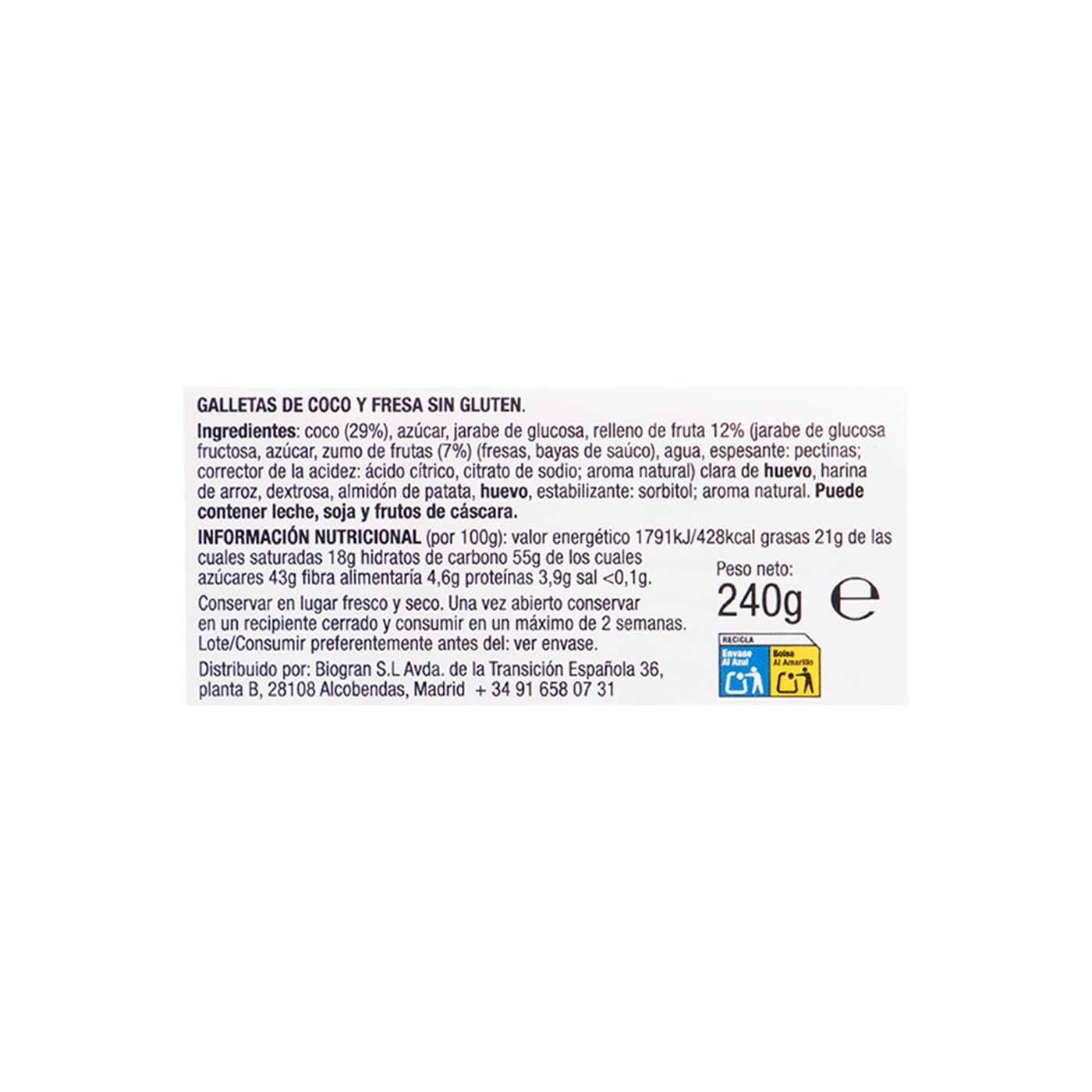 Snack que combina la suavidad del coco con el sabor dulce de las fresas. Estas galletas están elaboradas con ingredientes de alta calidad, con un relleno de frutas que incluye jugo de fresas y bayas de saúco, todo ello sin gluten.