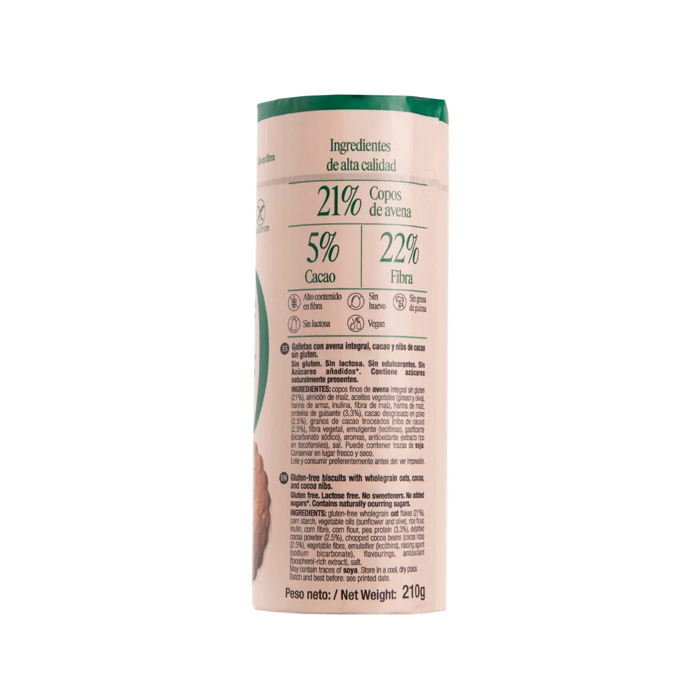 Copos finos de avena integral sin gluten (21%), almidón de maíz, aceites vegetales (girasol y oliva), harina de arroz, inulina, fibra de maíz, harina de maíz, proteína de guisante (3,3%), cacao desgrasado en polvo (2,5%), granos de cacao troceados (nibs de cacao) (2,5%), fibra vegetal, emulgente (lecitinas), gasificante (bicarbonato sódico), aromas, antioxidante (extracto rico en tocoferoles), sal . Puede contener trazas de soja.