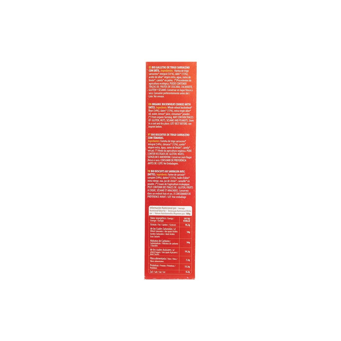 Delicioso aperitivo cuya receta incluye harina integral de trigo sarraceno, que representa el 54% de la composición, combinada con un 15% de dátiles, lo que les proporciona un sabor naturalmente dulce. Estas galletas tienen un sabor suave y una textura ligera.