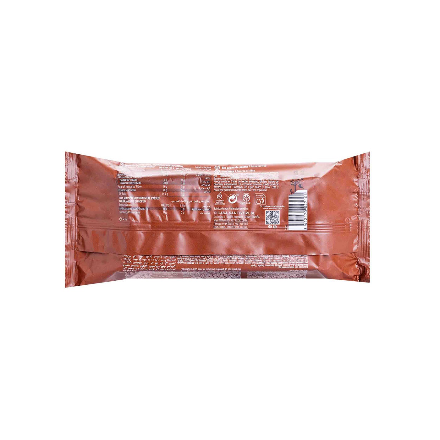 Harina de trigo sarraceno (40%), chocolate negro (30%) (pasta de cacao, edulcorante: maltitol, manteca de cacao, cacao desgrasado en polvo, emulgentes (lecitina de soja, polrricinoleato de poliglicerol), aroma natural vainilla), edulcorante (jarabe de maltitol), almidón de maíz, aceites vegetales (girasol, oliva), fibra vegetal, emulgente (lecitinas), sal, aroma, colorante (caramelo natural), gasificante (bicarbonato sódico), antioxidante (extracto rico en tocoferoles).