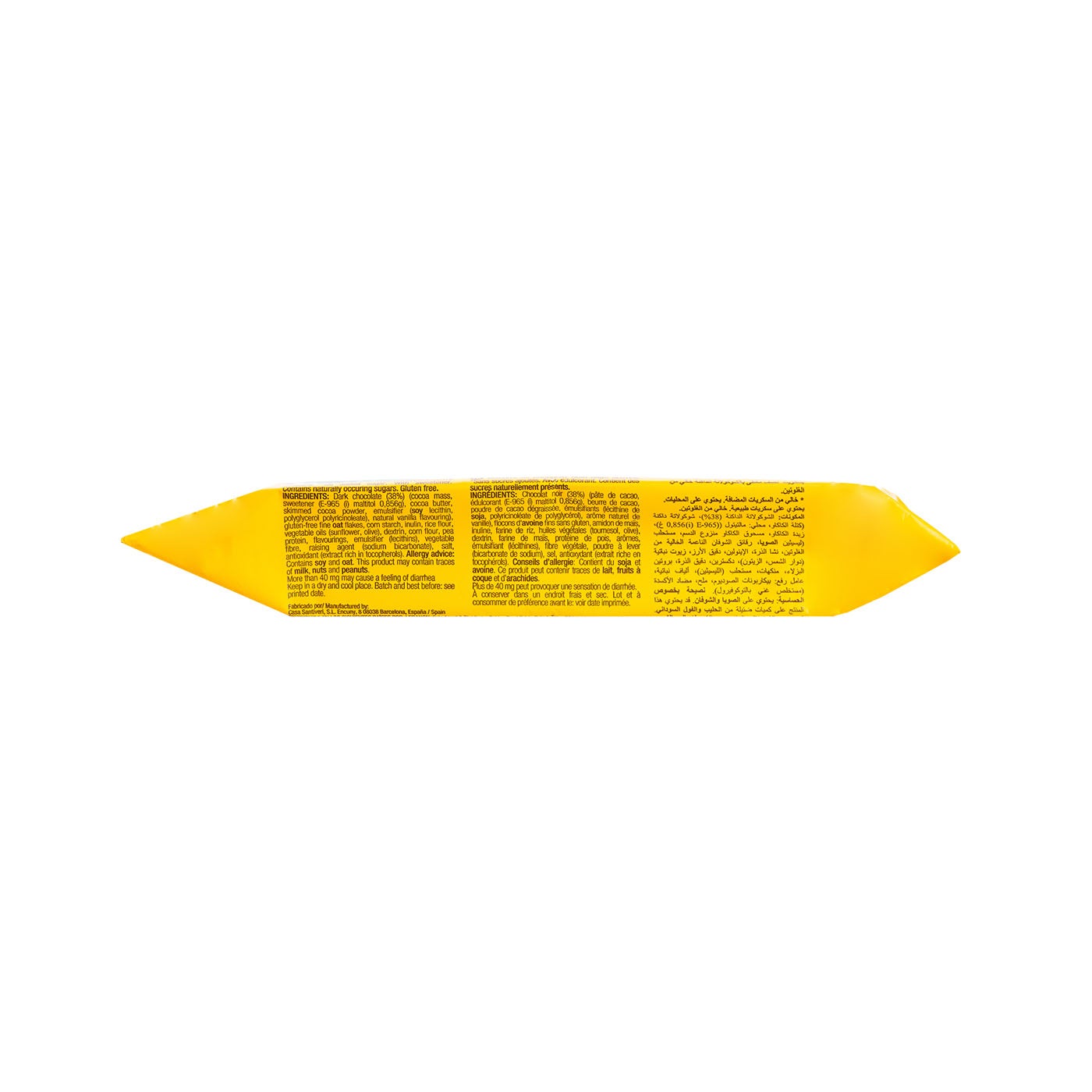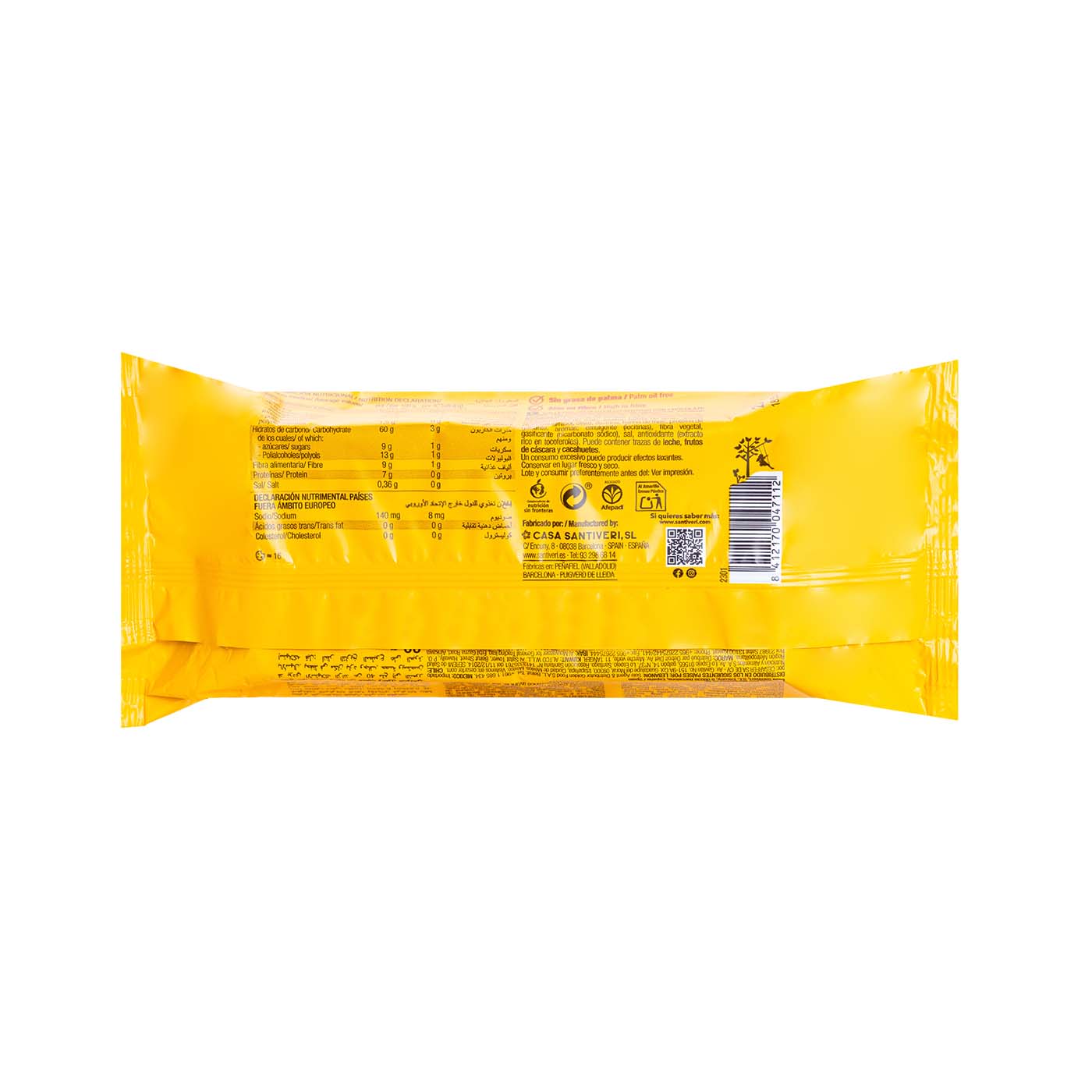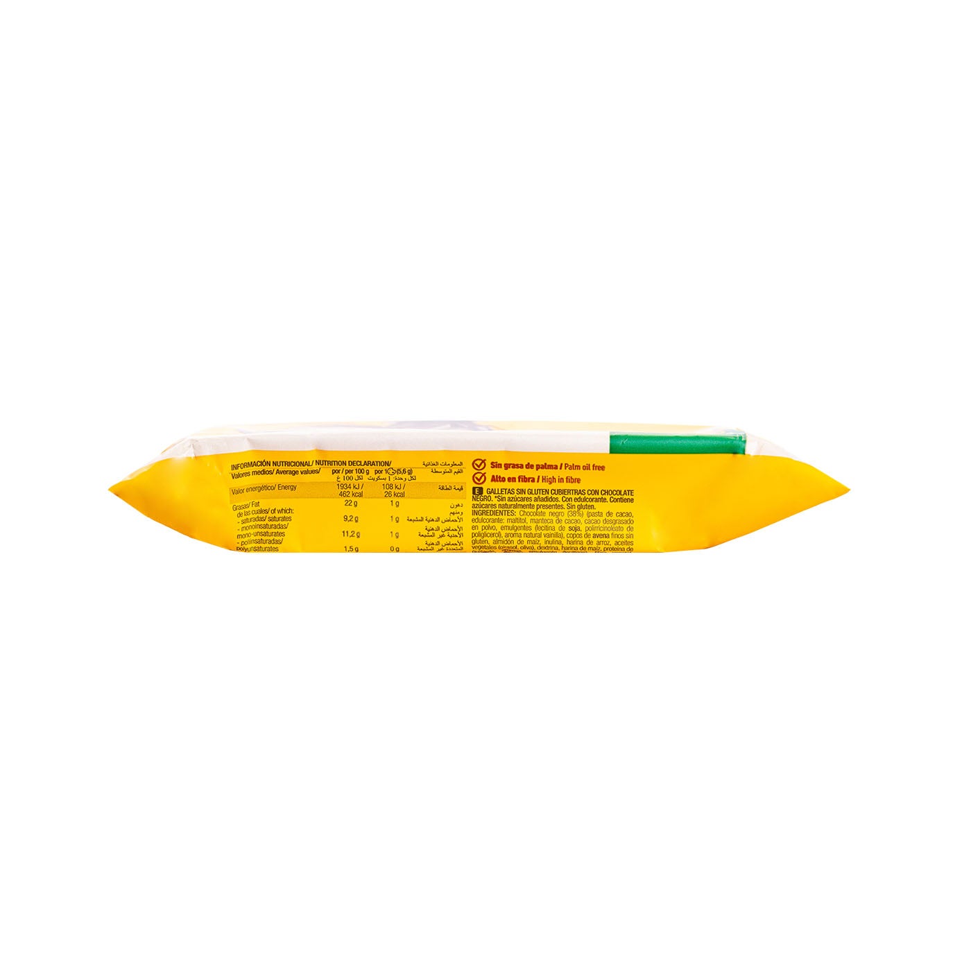 Galletas crujientes y finas elaboradas sin gluten y cubiertas con una capa de chocolate. Son una opción deliciosa y apta para personas con intolerancia al gluten. Además, no contienen azúcares añadidos y están enriquecidas con fibra, lo que las convierte en un tentempié sabroso.