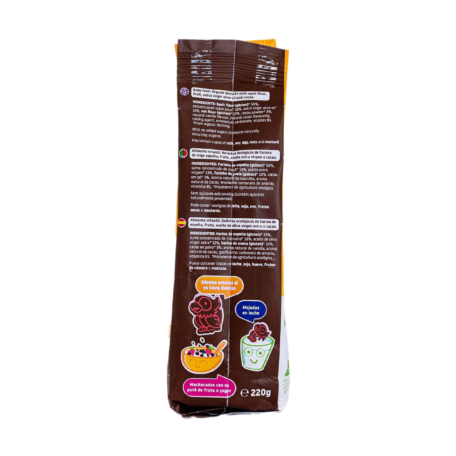 Harina de trigo espelta* 55%, zumo de manzana concentrado* 18%, aceite de oliva virgen extra* 13%, harina de avena* 10%, cacao en polvo* 3%, aroma natural de vainilla, aroma natural de cacao, gasificante (carbonato de amonio), vitamina B1. Pueden contener trazas de leche, soja, huevo, frutos de cáscara y mostaza *De producción ecológica.