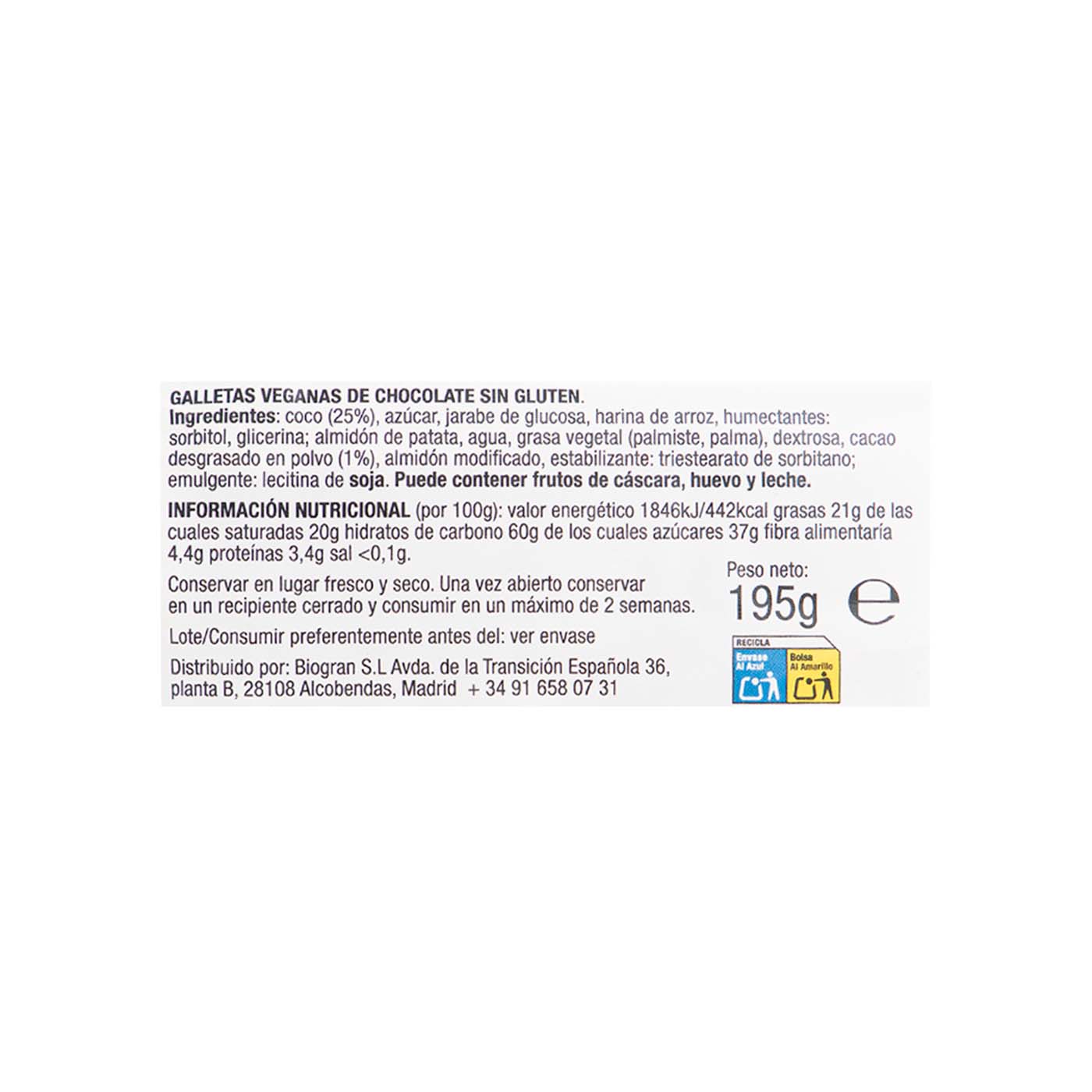 Delicioso snack diseñado para quienes buscan opciones sin gluten y aptas para veganos. Estas galletas combinan el sabor irresistible del chocolate con una textura crujiente, perfectas para disfrutar en cualquier momento del día.