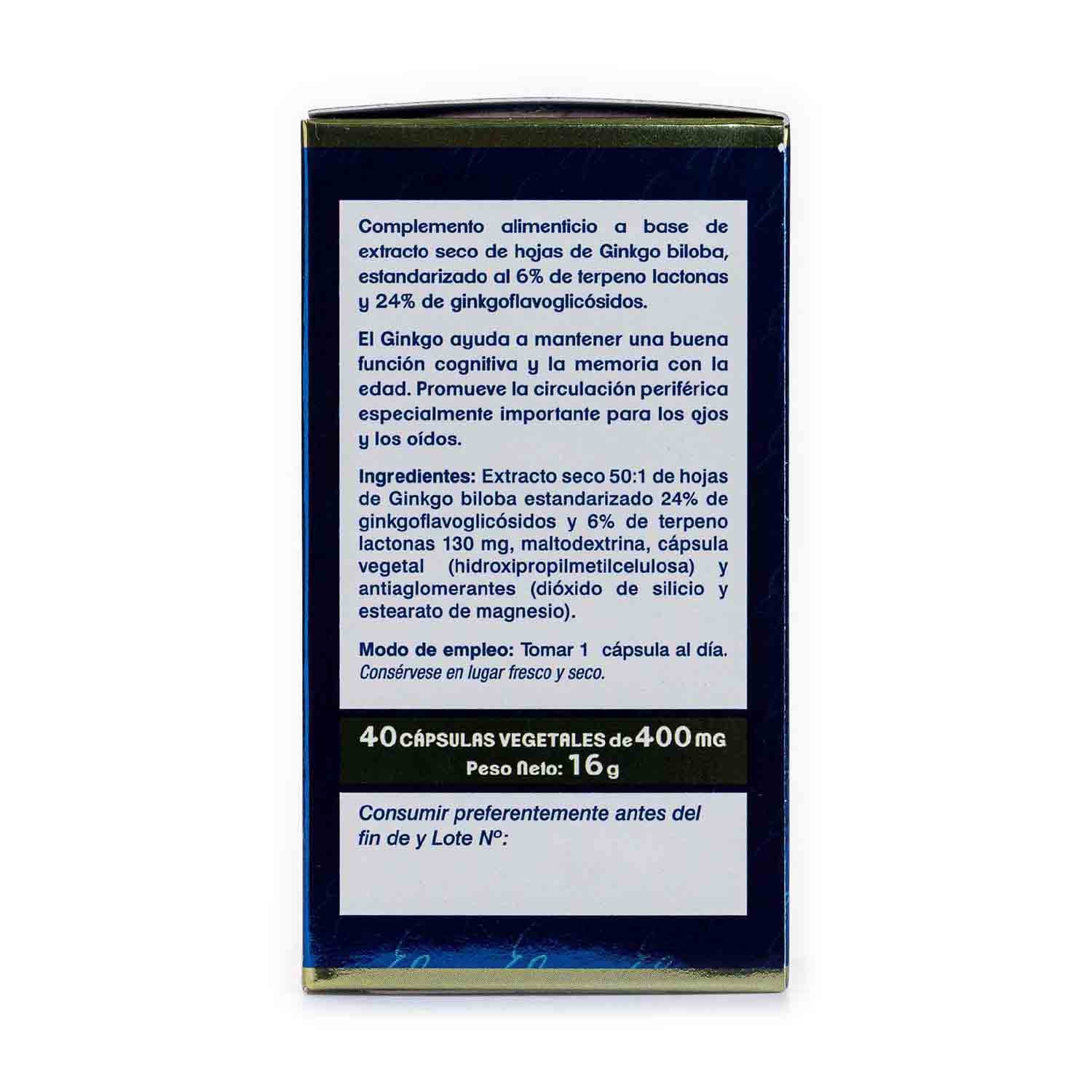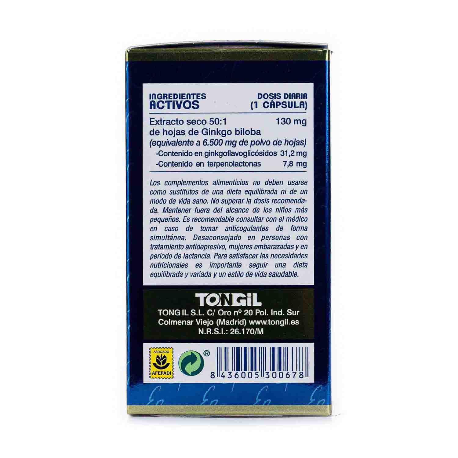 Ginkgo Biloba 6500mg. en cápsulas. Extracto seco concentrado 50:1 de hojas de Ginkgo biloba, estandarizado al 24% de ginkgoflavoglicósidos y 6% de terpenolactonas