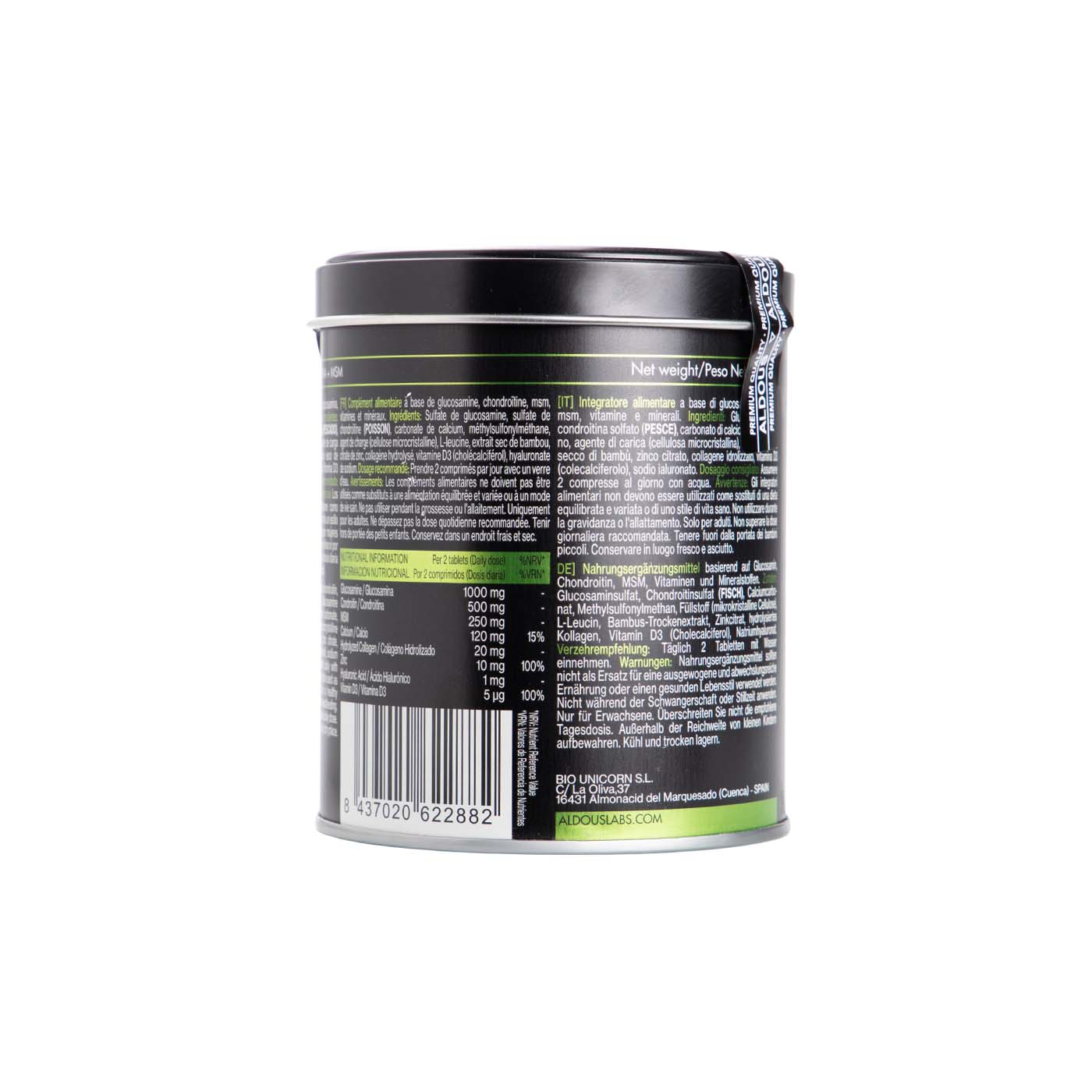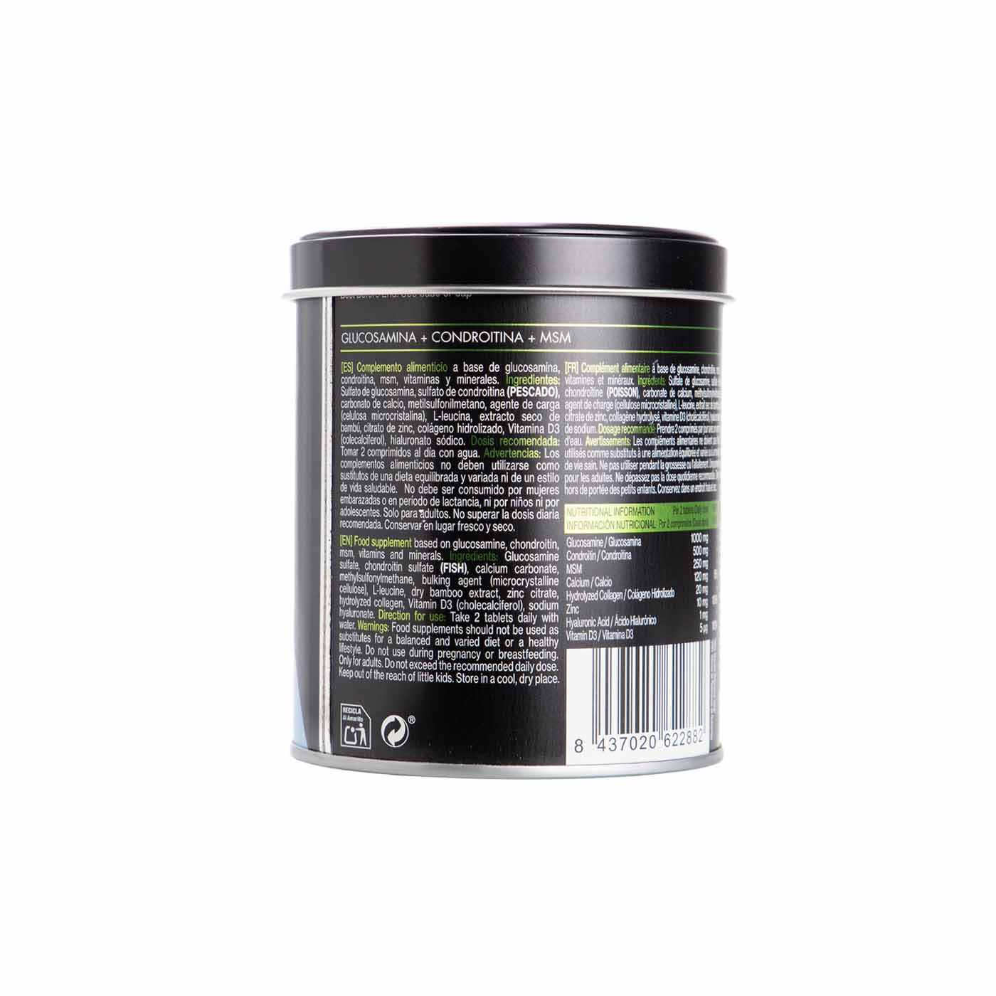 Sulfato de glucosamina, sulfato de condroitina (PESCADO), carbonato de calcio, metilsulfonilmetano, agente de carga (celulosa microcristalina), L-leucina, extracto seco de bambú, citrato de zinc, colágeno hidrolizado, Vitamina D3 (colecalciferol), hialuronato sódico.