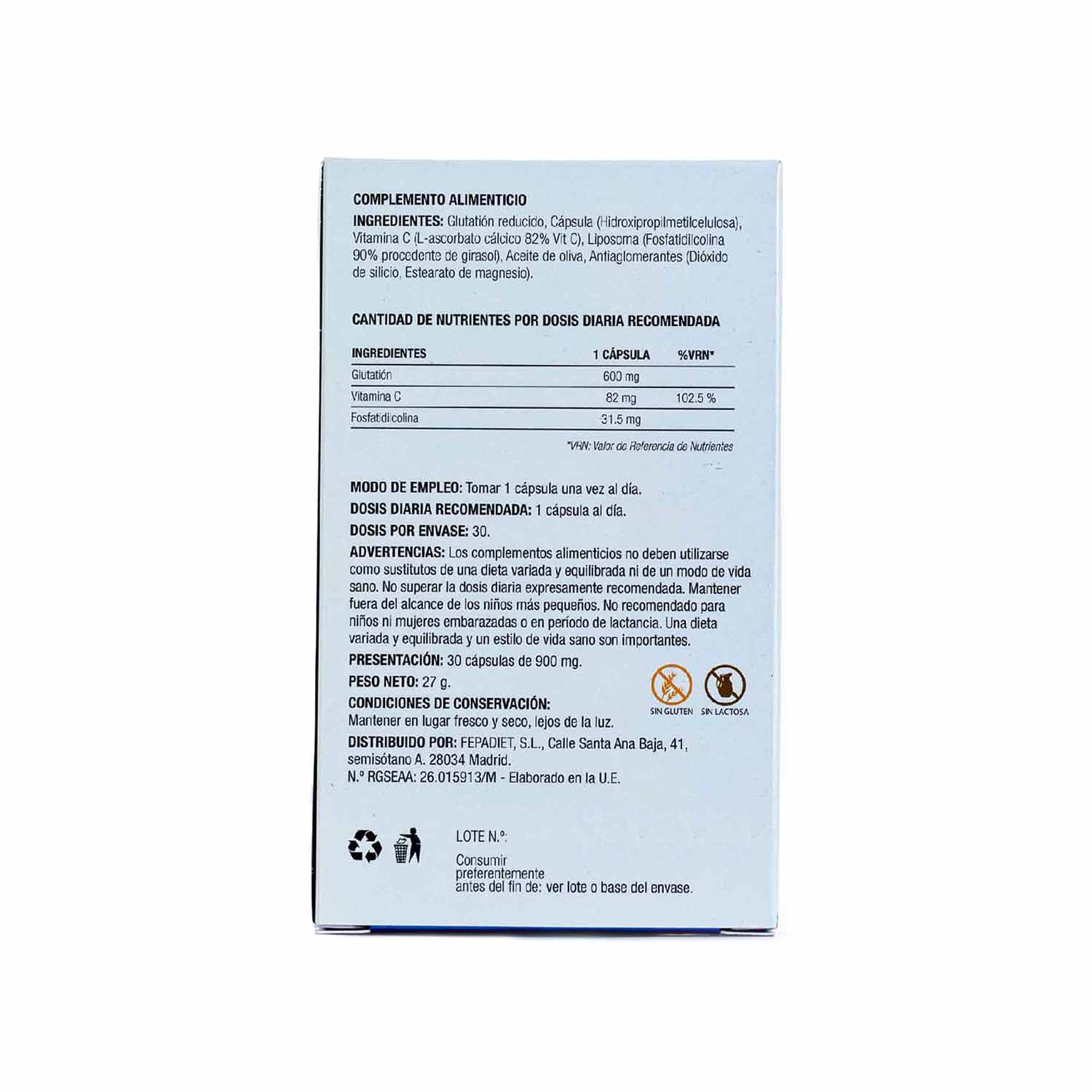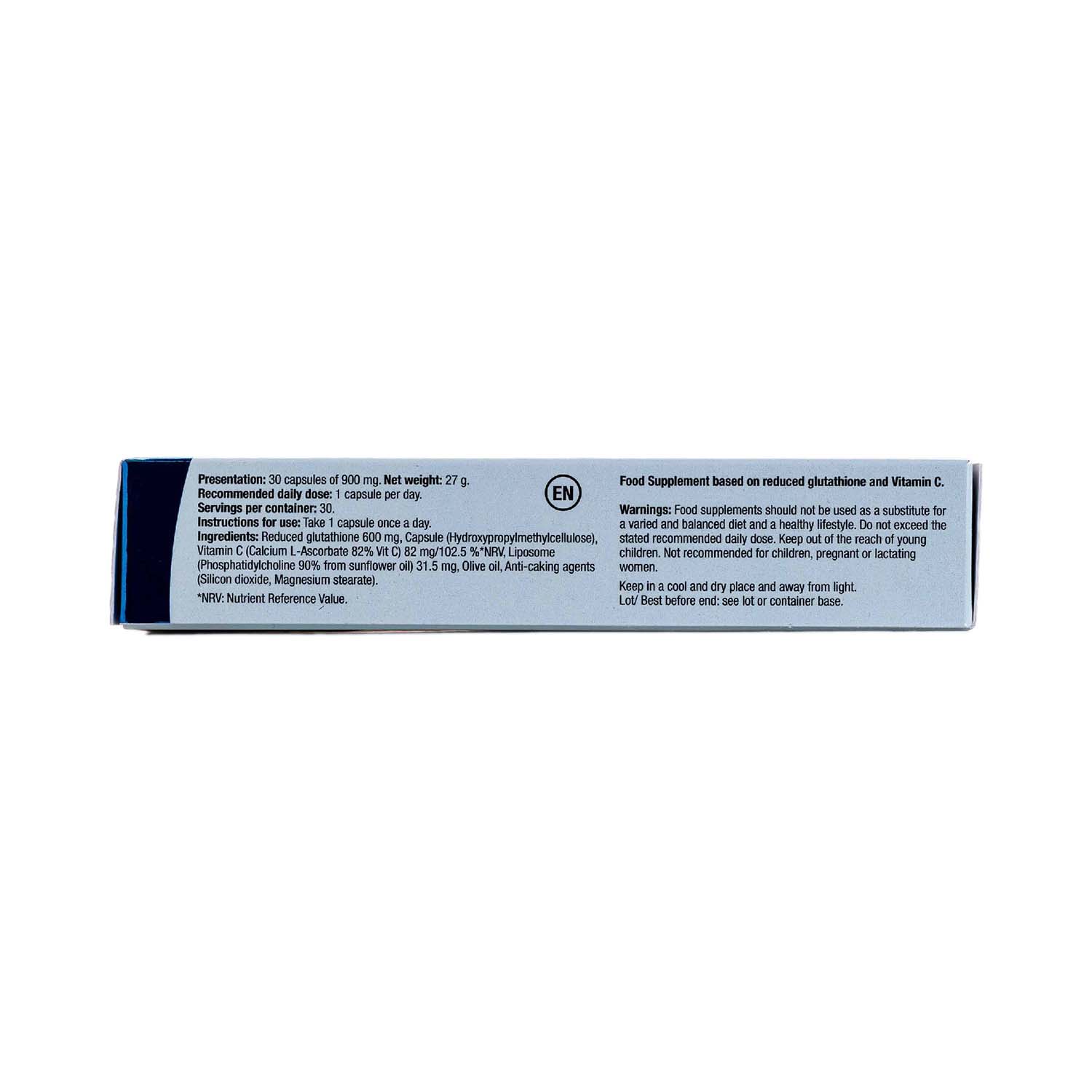Glutatión reducido, Cápsula (Hidroxipropilmetilcelulosa), Vitamina C (L-ascorbato cálcico 82% Vit C), Liposoma (Fosfatidilcolina 90% procedente de girasol), Aceite de oliva, Antiaglomerantes (Dióxido de silicio, Estearato de magnesio).