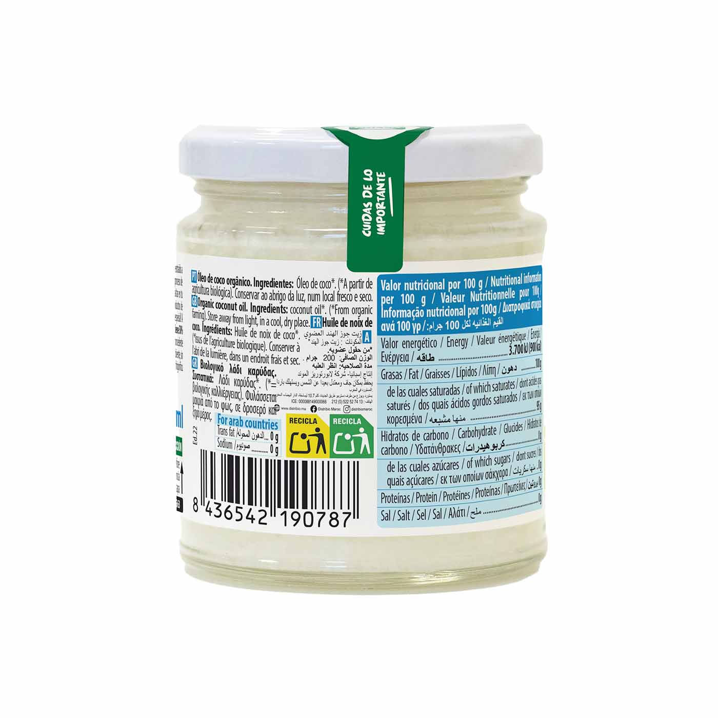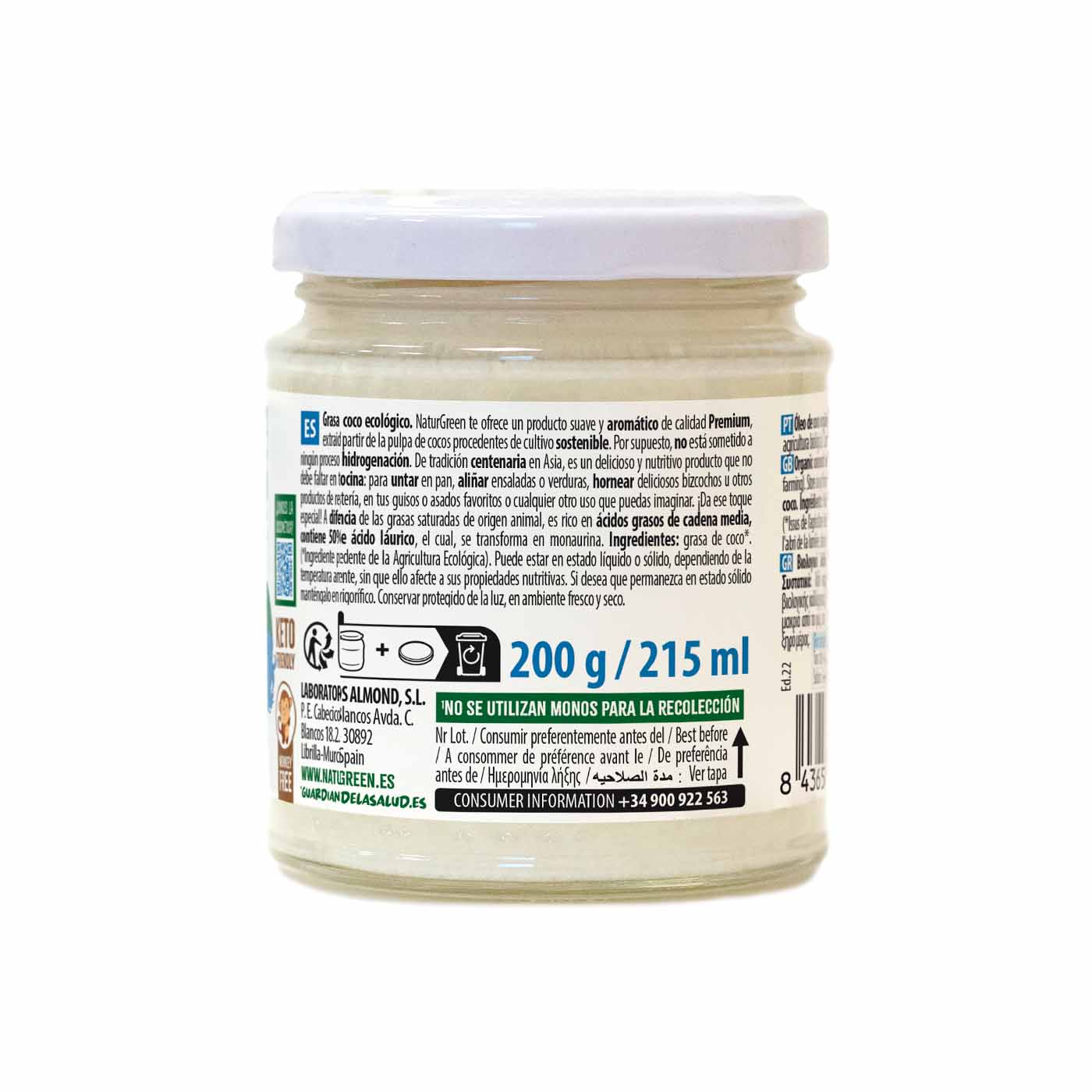 La Grasa de coco bio 200 g Naturgreen es una grasa vegetal pura obtenida exclusivamente de cocos procedentes de agricultura ecológica. Se presenta en un práctico formato de 200 g y destaca por su textura sólida a temperatura ambiente y su suave aroma natural. Es un ingrediente muy versátil que puede emplearse tanto en cocina como en rutinas de cuidado personal, convirtiéndose en un básico imprescindible en hogares que buscan productos saludables, naturales y libres de aditivos.