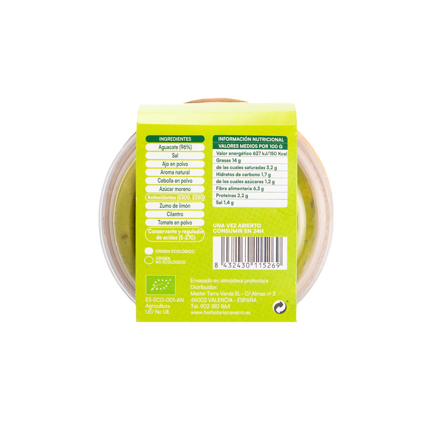 Aguacate*(96%), sal*, ajo* en polvo, aroma natural*, cebolla* en polvo, azúcar moreno*, antioxidantes (E300, E330), zumo de limón*, cilantro*, tomate* en polvo, conervante y regulador de acidez (E-270). *Origen ecológico.